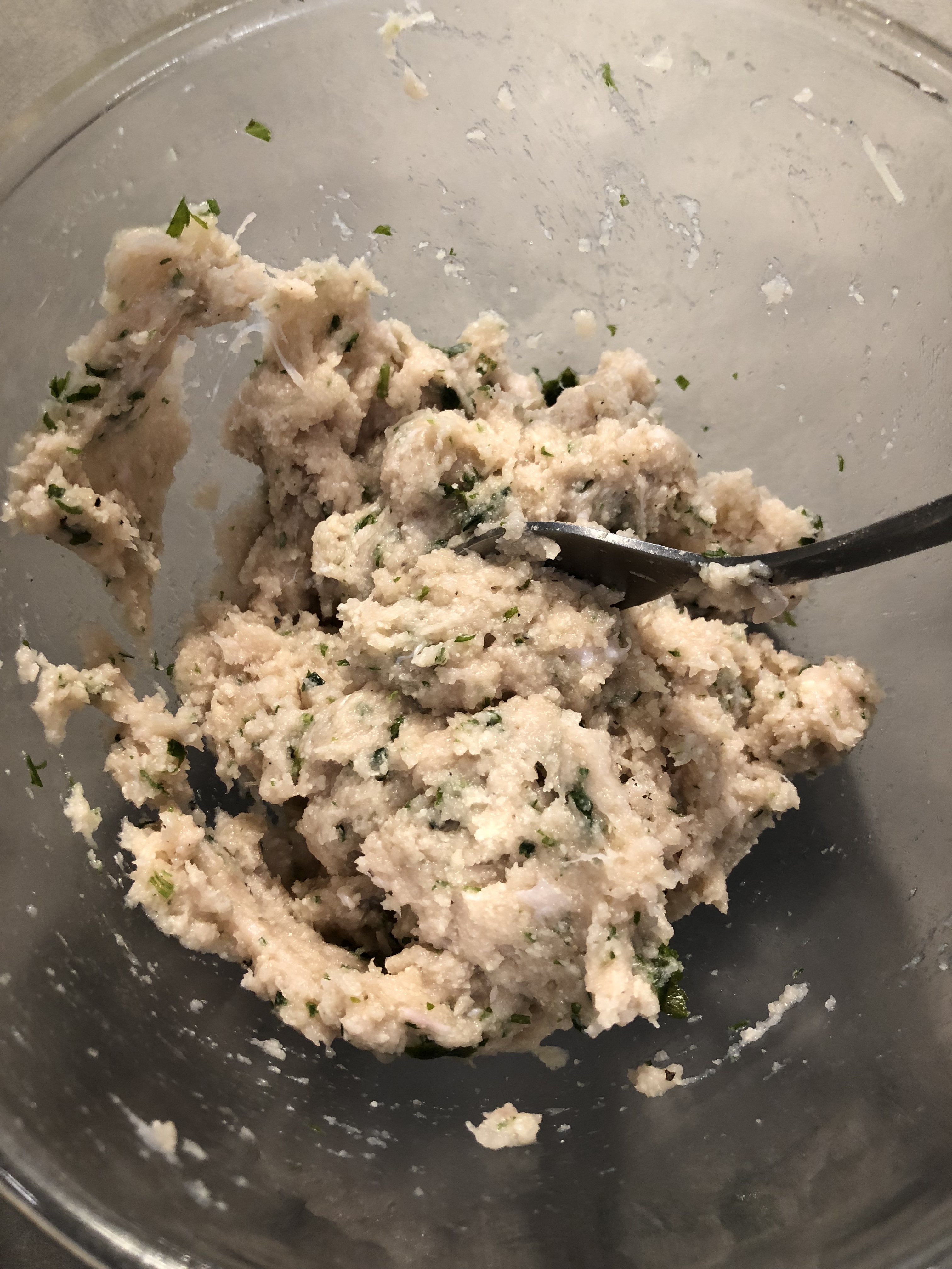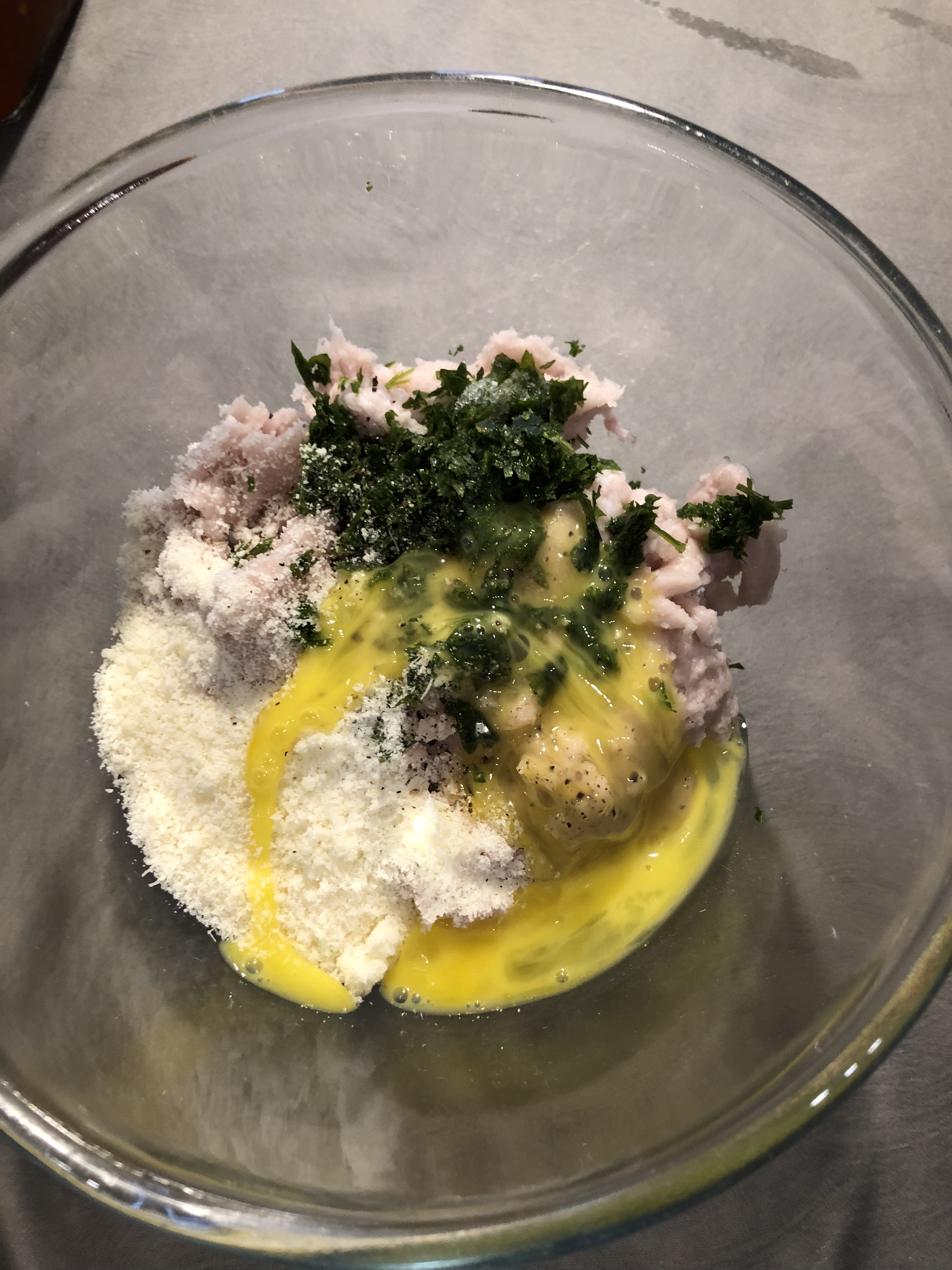 Verso il composto ottenuto in una ciotola e unisco il formaggio grattugiato, il prezzemolo, sale, pepe