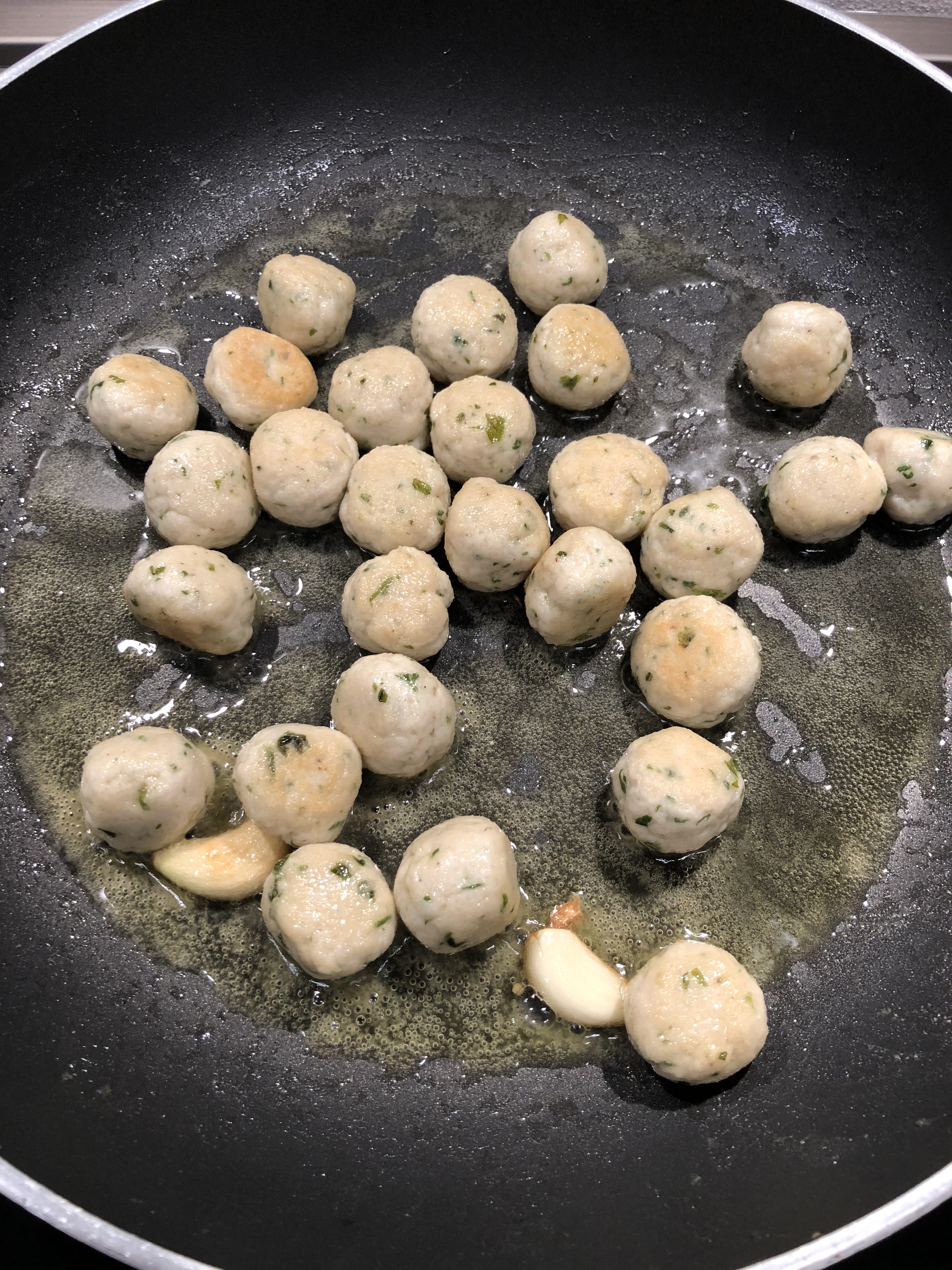 In una larga padella scaldo abbondante olio, uno spicchio di aglio e aggiungo le polpettine e le lascio rosolare