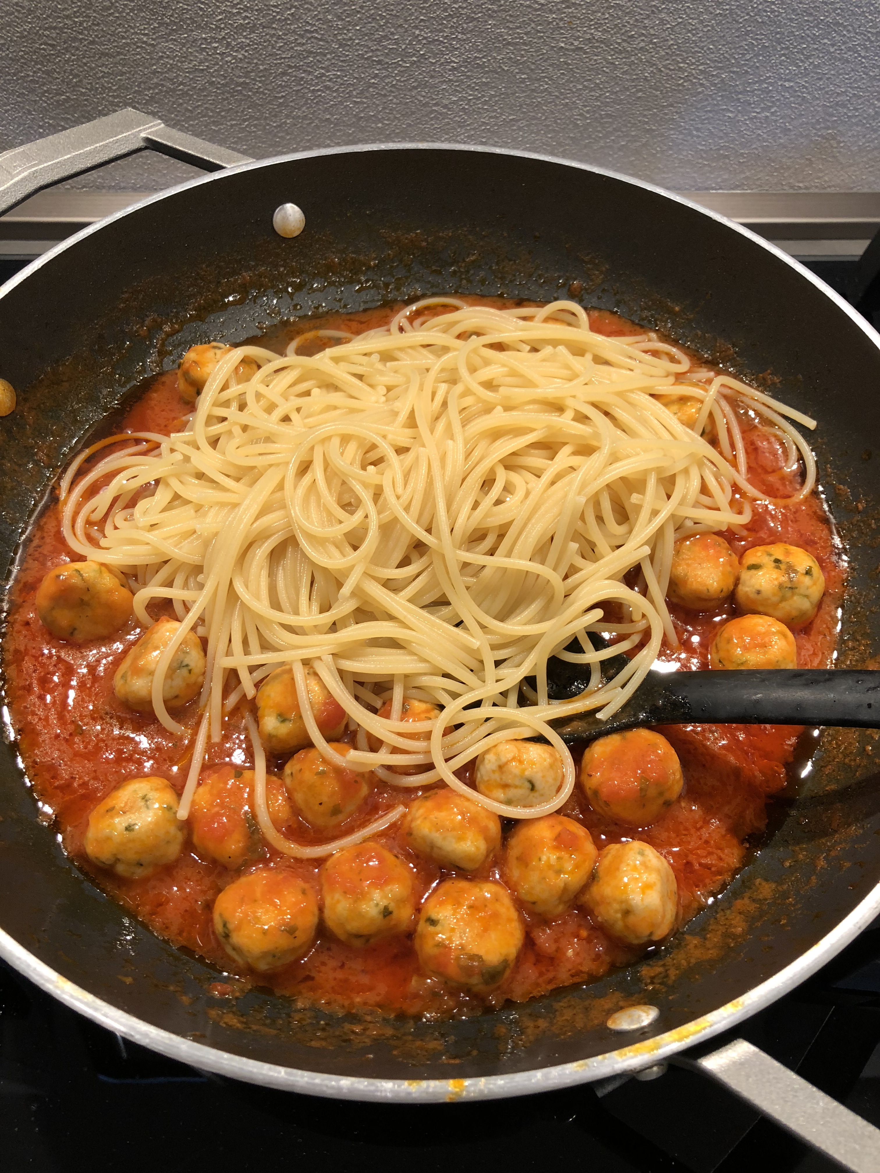 Quando gli spaghetti sono cotti li aggiungo al sugo caldo, li lascio mantecare alcuni minuti mescolando delicatamente per non rompere le polpettine, se serve unite qualche cucchiaio di acqua di cottura della pasta