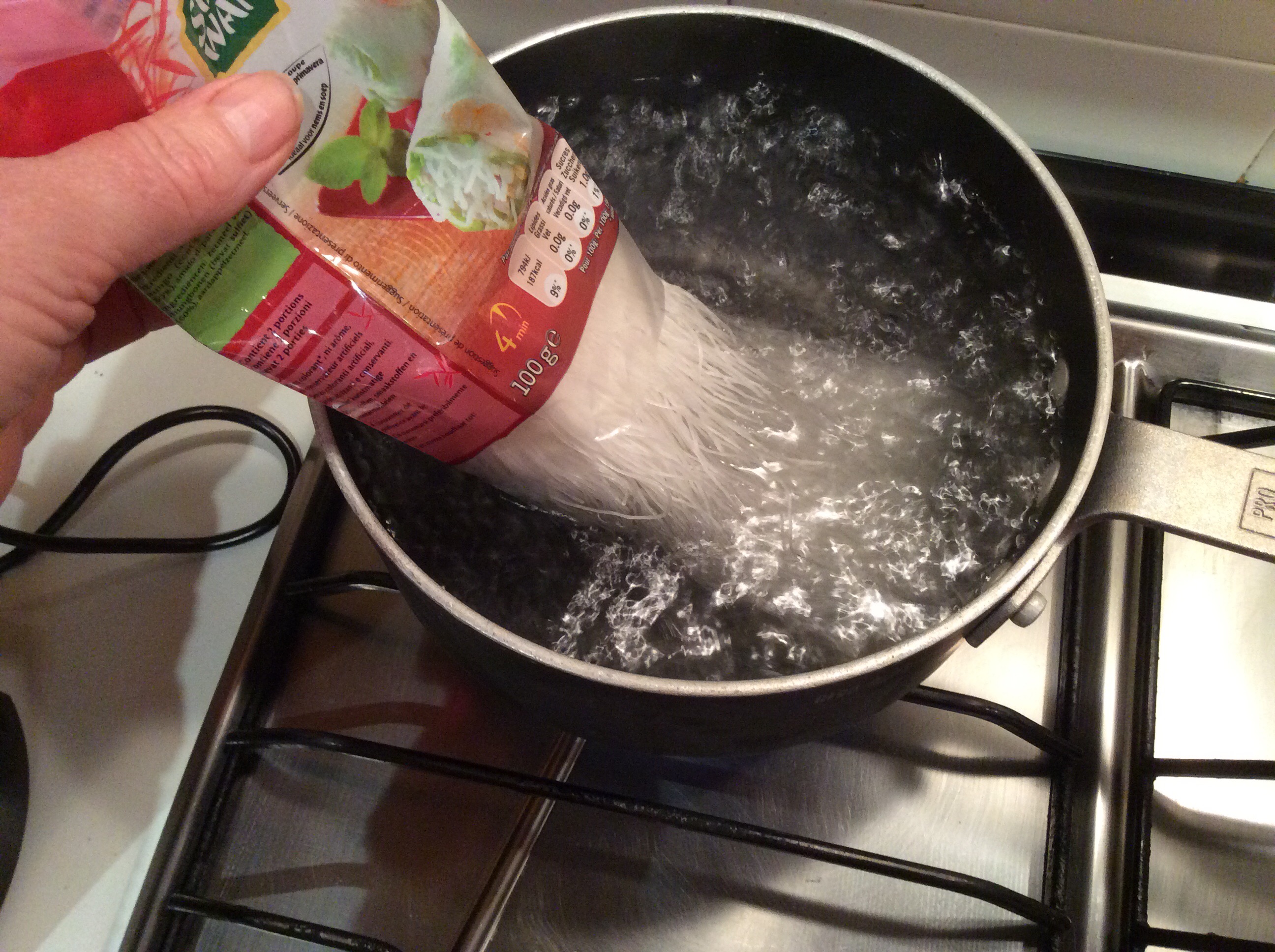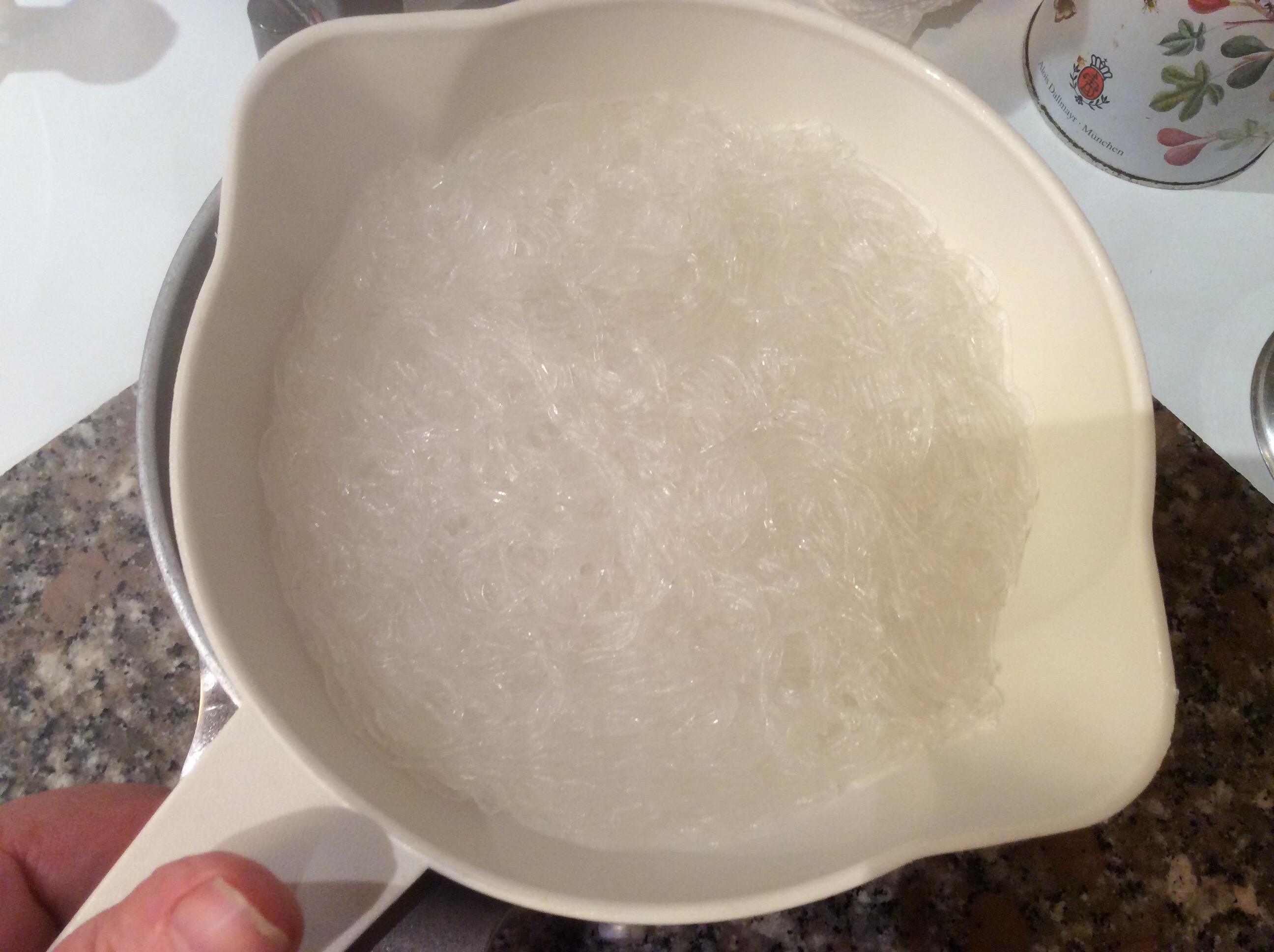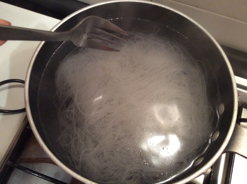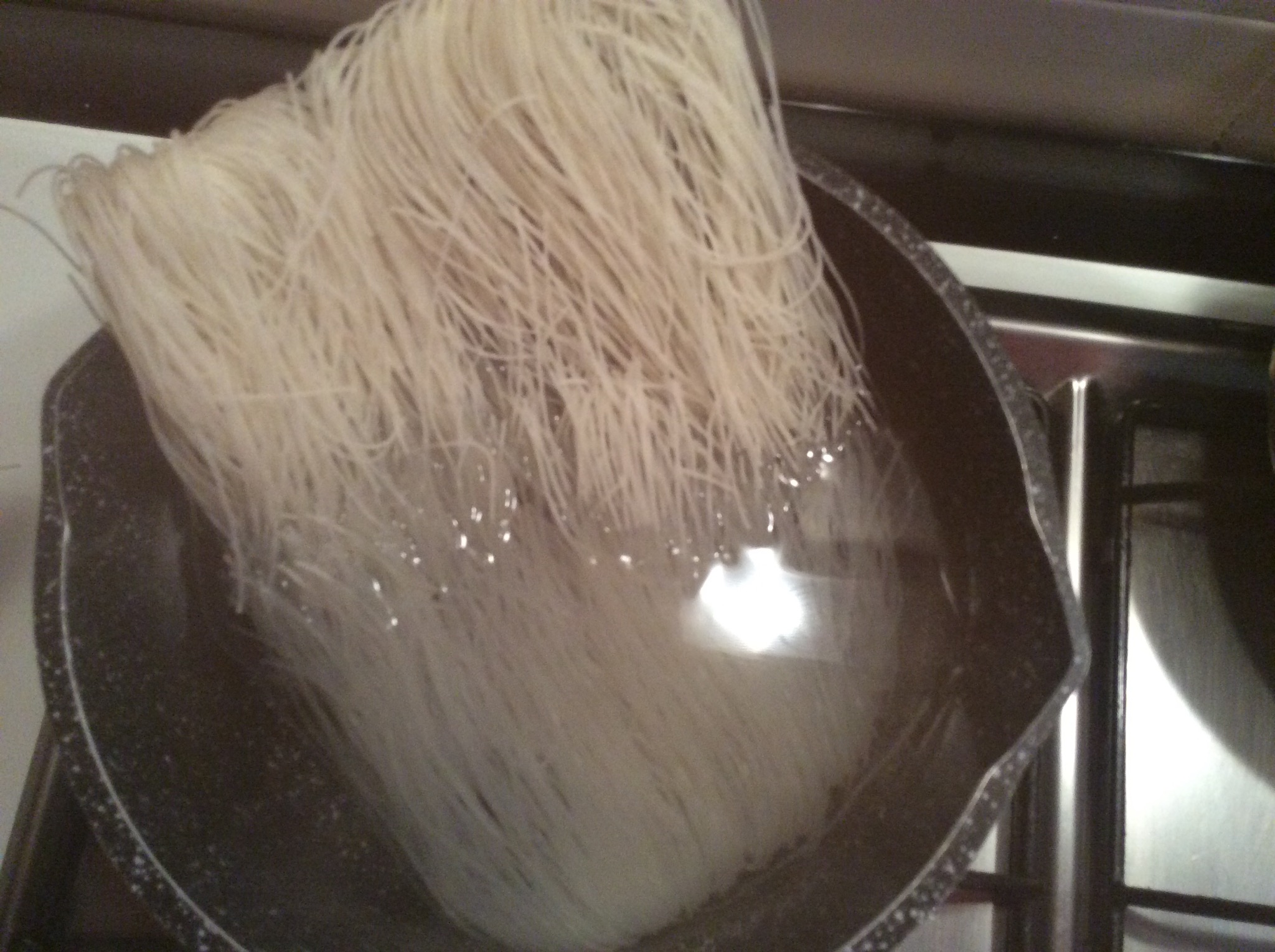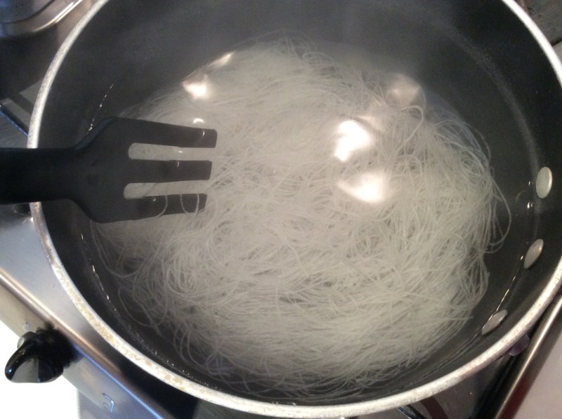 Intanto porto a bollore una pentola con acqua, spengo quindi il fuoco e aggiungo gli spaghetti di soia, li mescolo e li lascio riposare coperti per 4 minuti