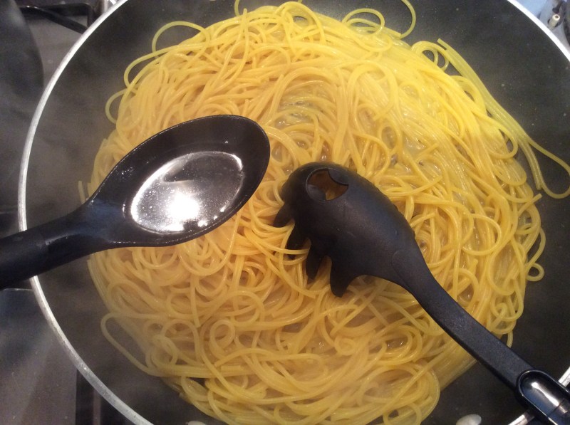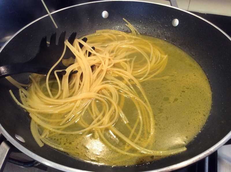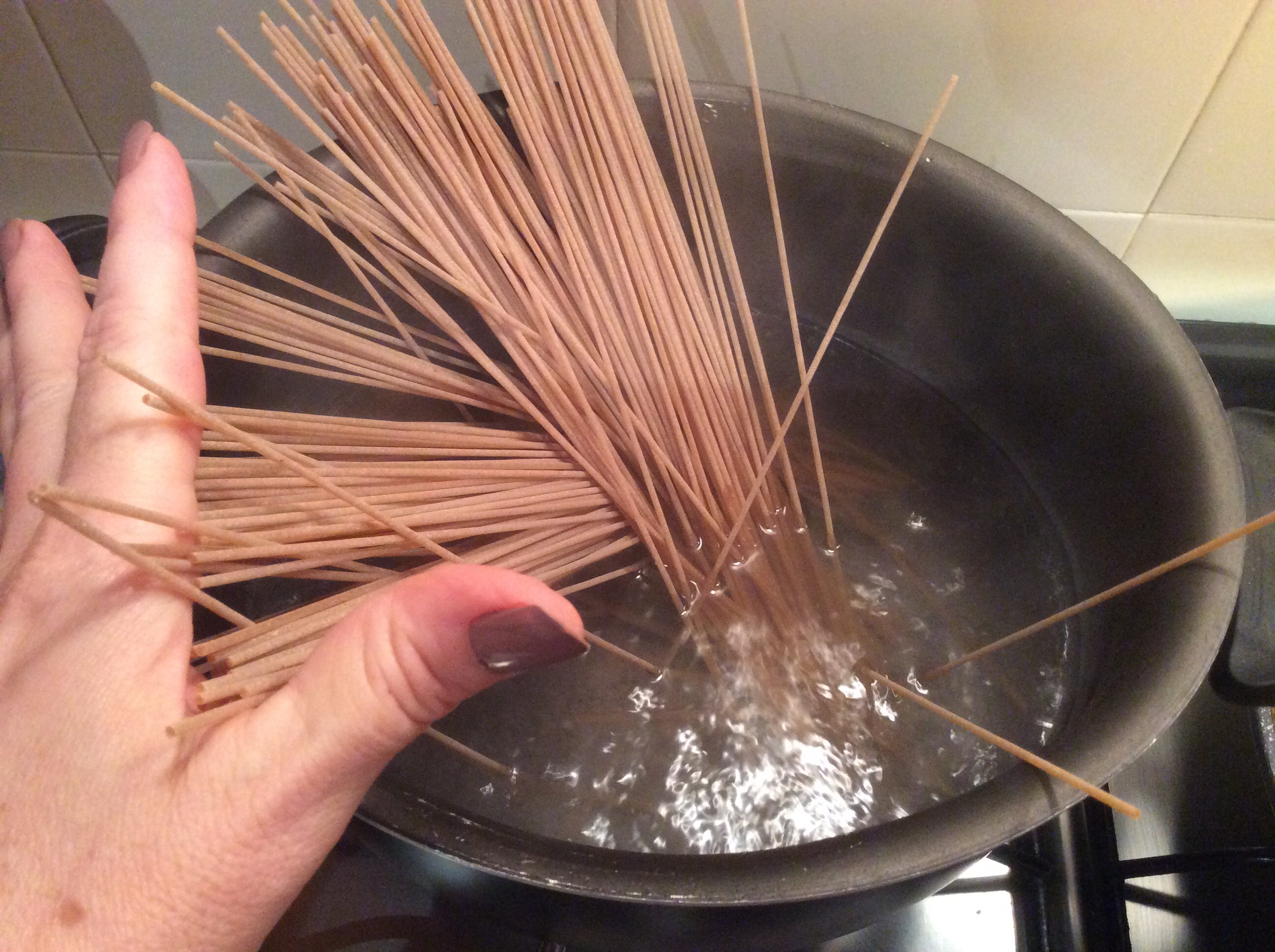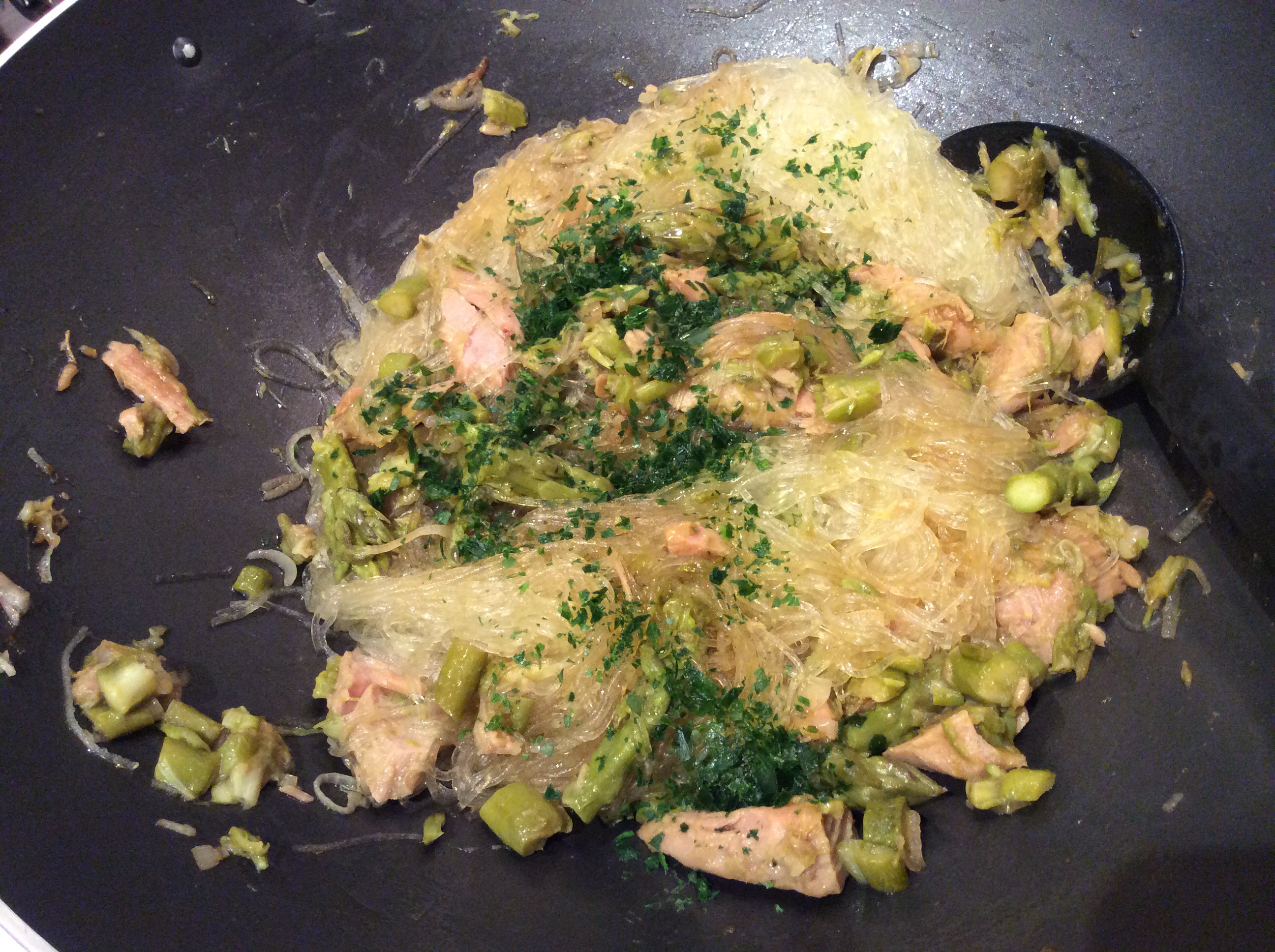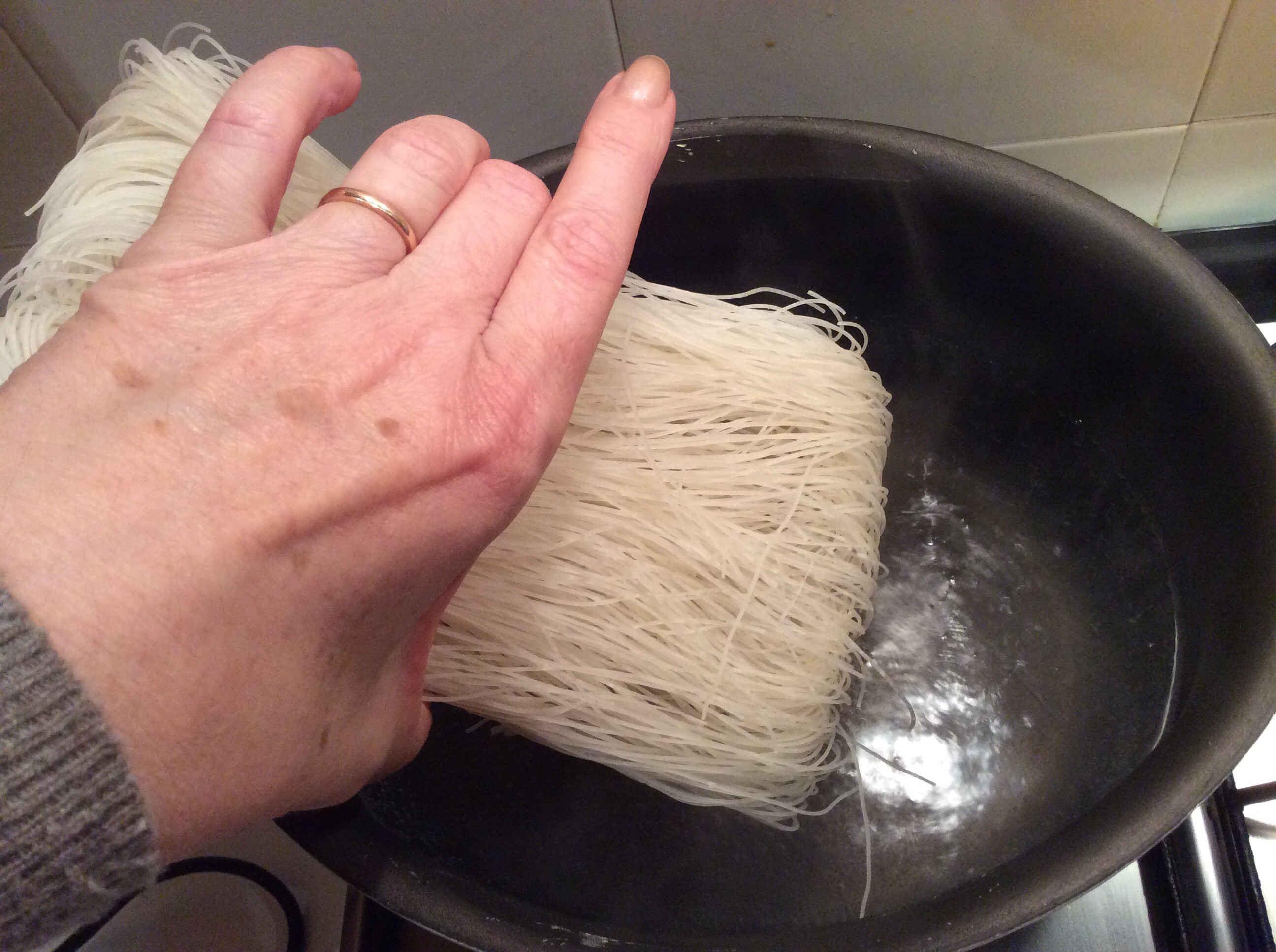 Intanto porto a bollore una pentola con acqua, spengo quindi il fuoco e aggiungo gli spaghetti di soia, li mescolo e li lascio riposare coperti per 4 minuti