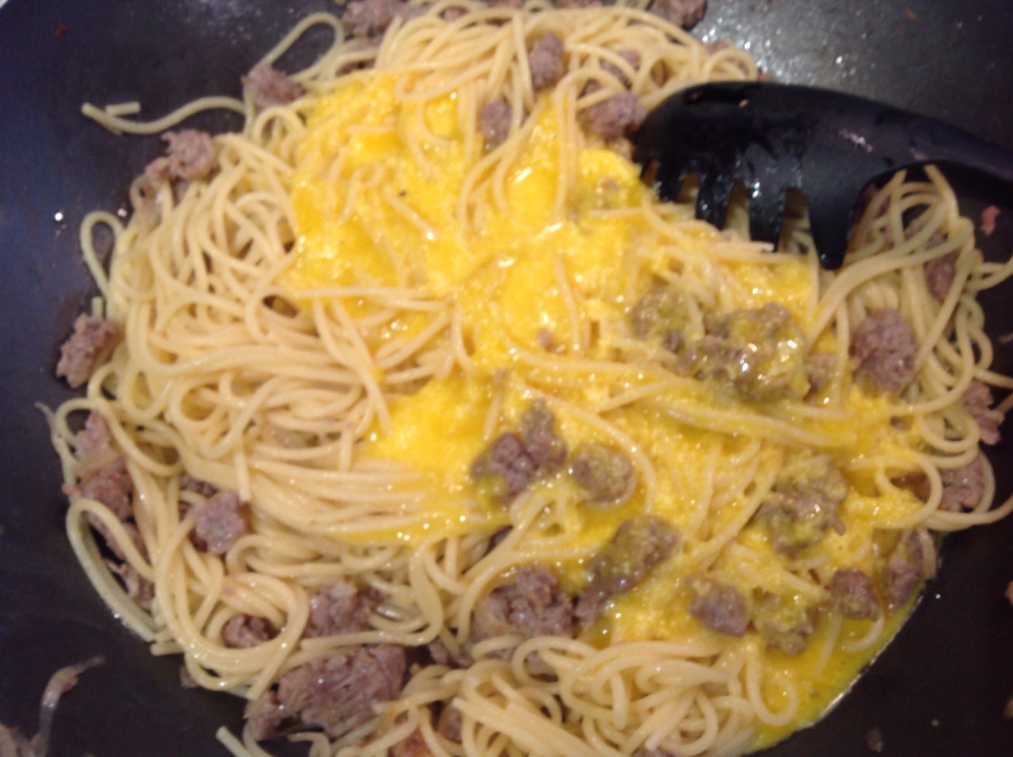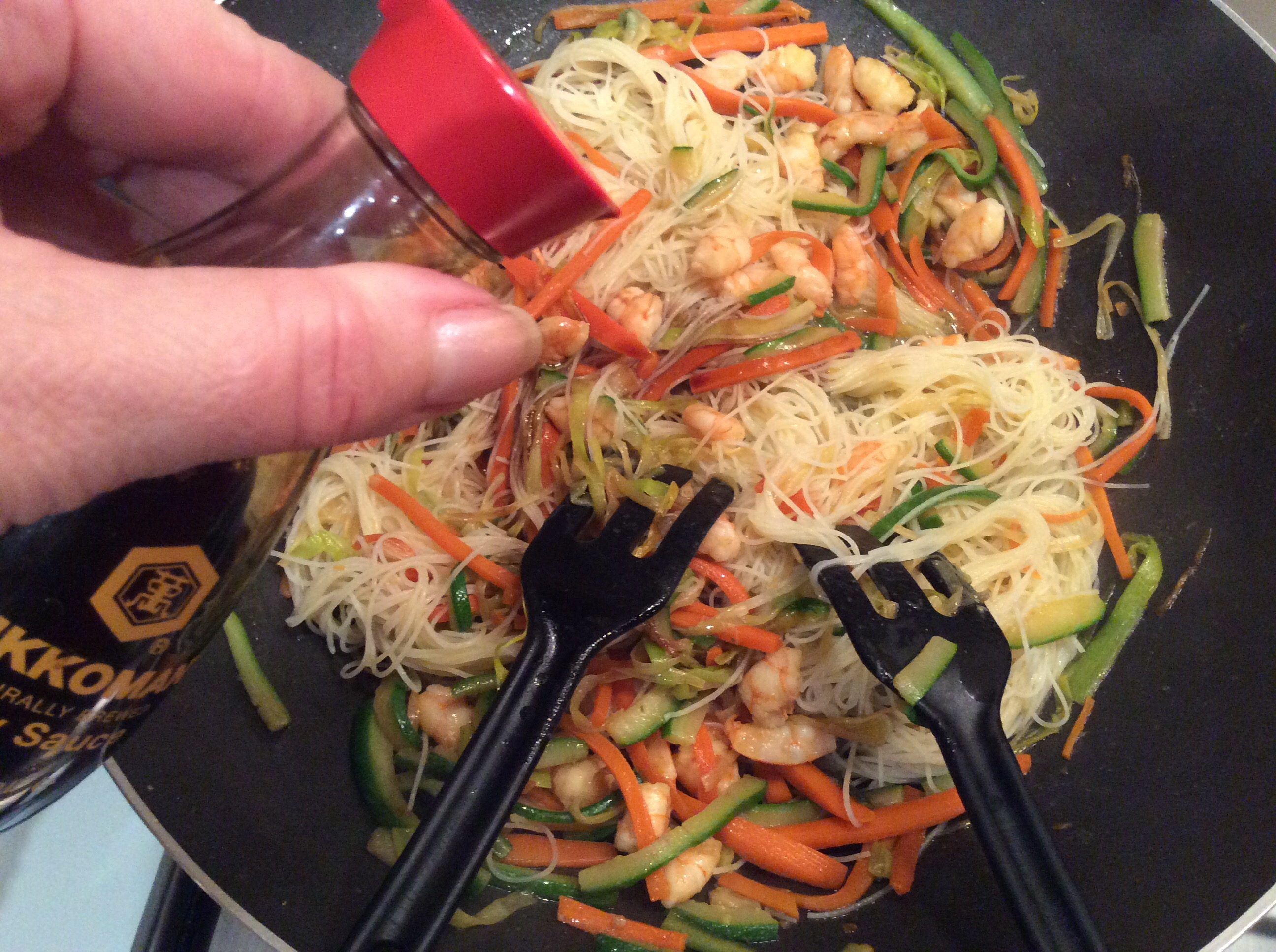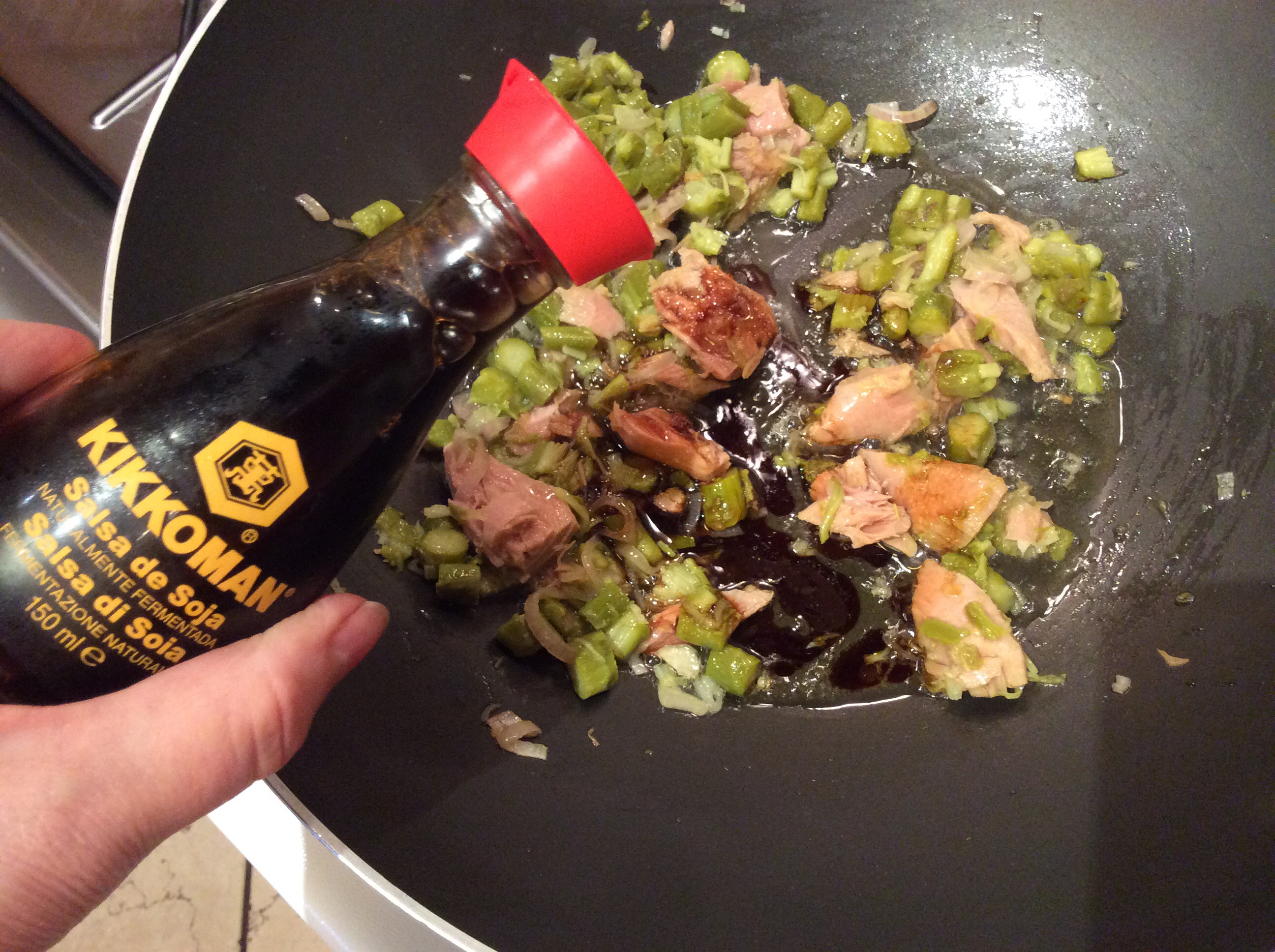 Li verso nella padella con le verdure mescolandoli bene e aggingo 4/5 cucchiai di salsa di soia