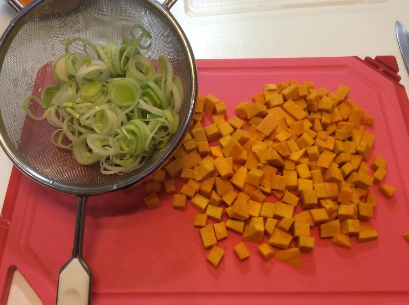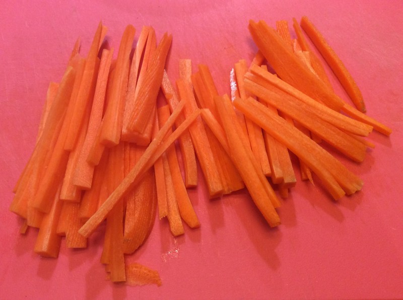 Per prima cosa preparo tutte le verdure lavate e pelate, inizio con la carota che taglio a pezzi poi a fette e a bastoncini sottili