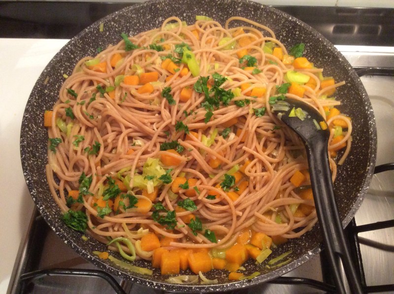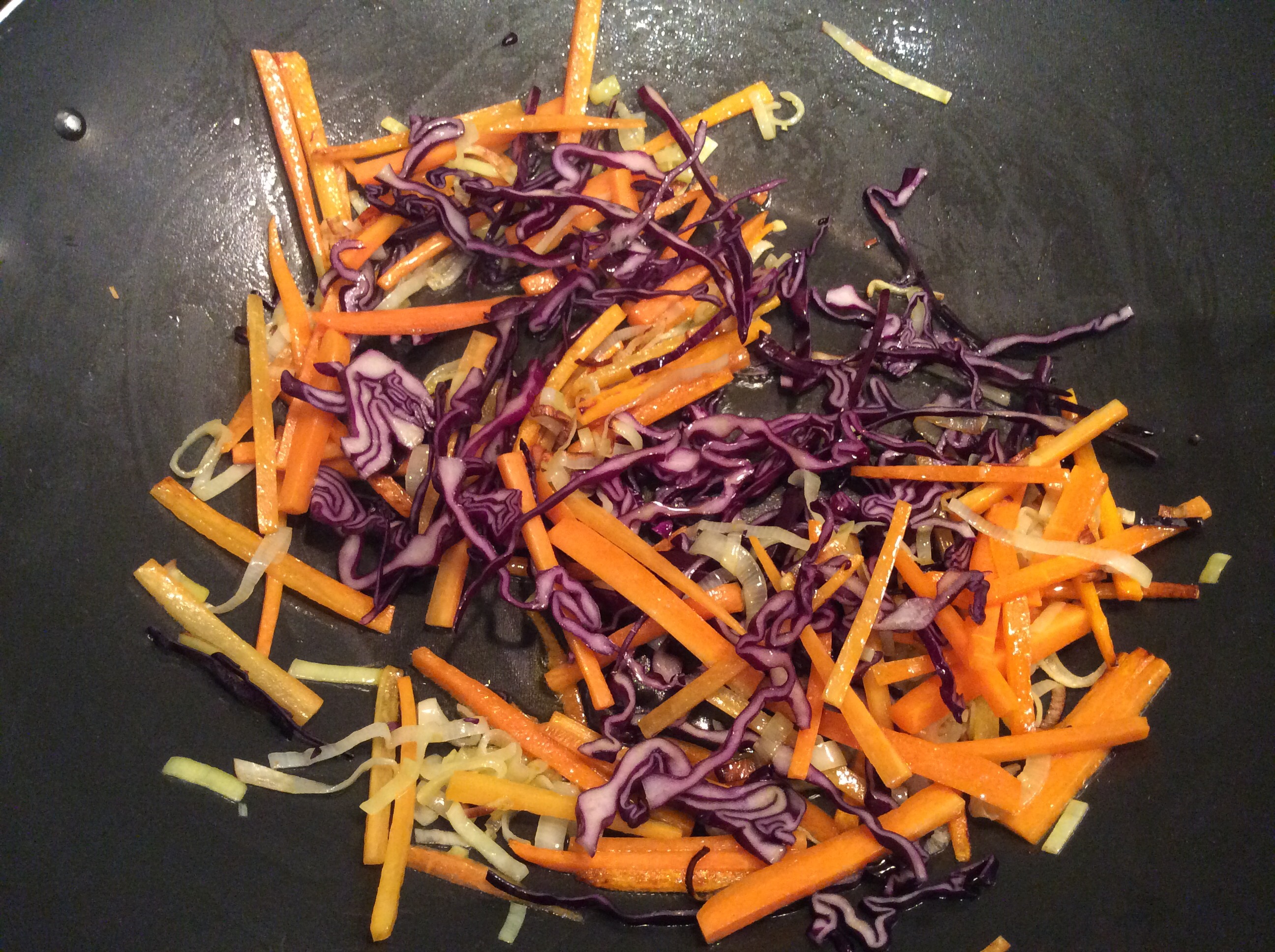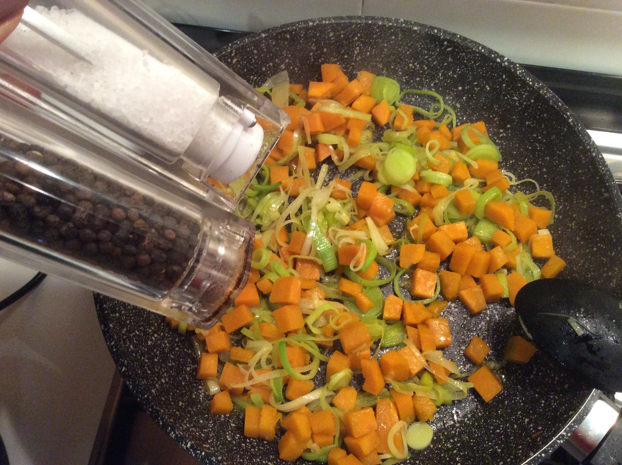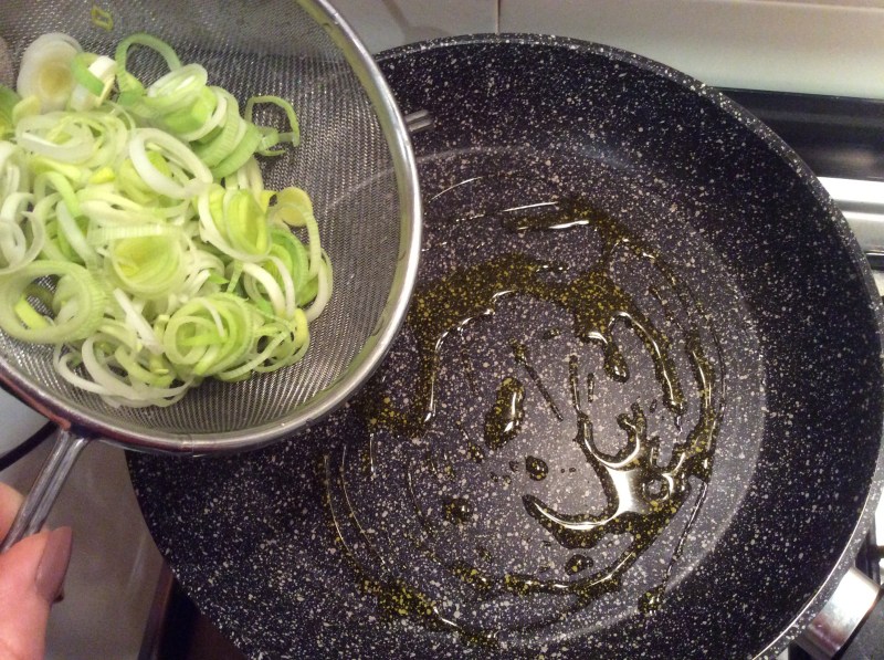 In una padella fonda tipo Wok verso dell’olio extravergine senza esagerare e lascio appassire per qualche minuto il porro o la cipolla quindi aggiungo le carote e le cuocio a fiamma alta per 5 minuti