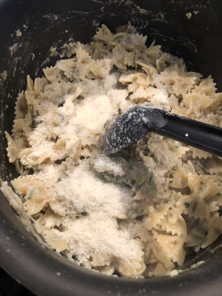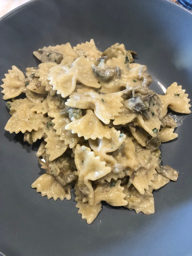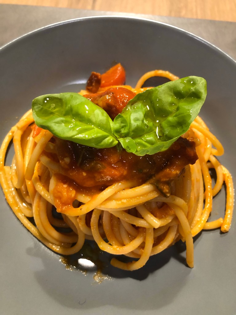 Cuocio la pasta, la aggiungo al sugo con un paio di cucchiai di acqua di cottura, aggiungo del Parmigiano, manteco e servo aggiungendo un filo di olio