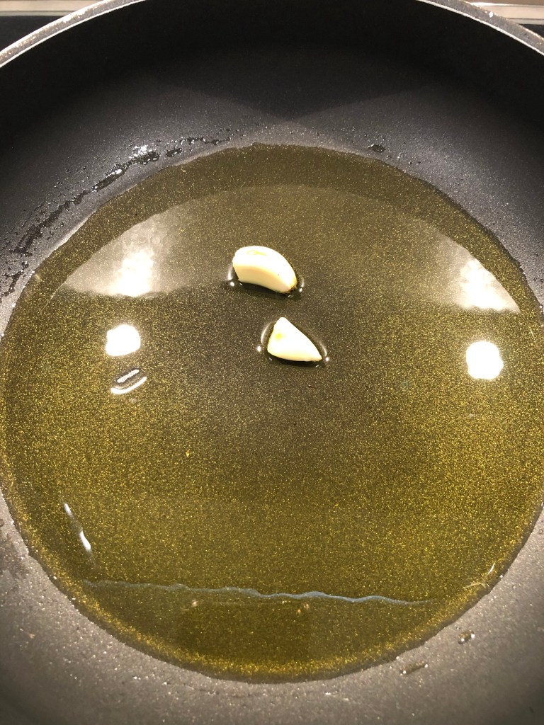 Li taglio a piccoli cubetti e li metto in una padella con olio extravergine e uno spicchio di aglio