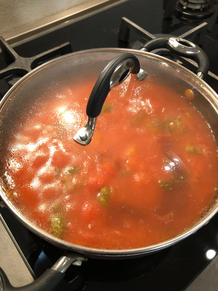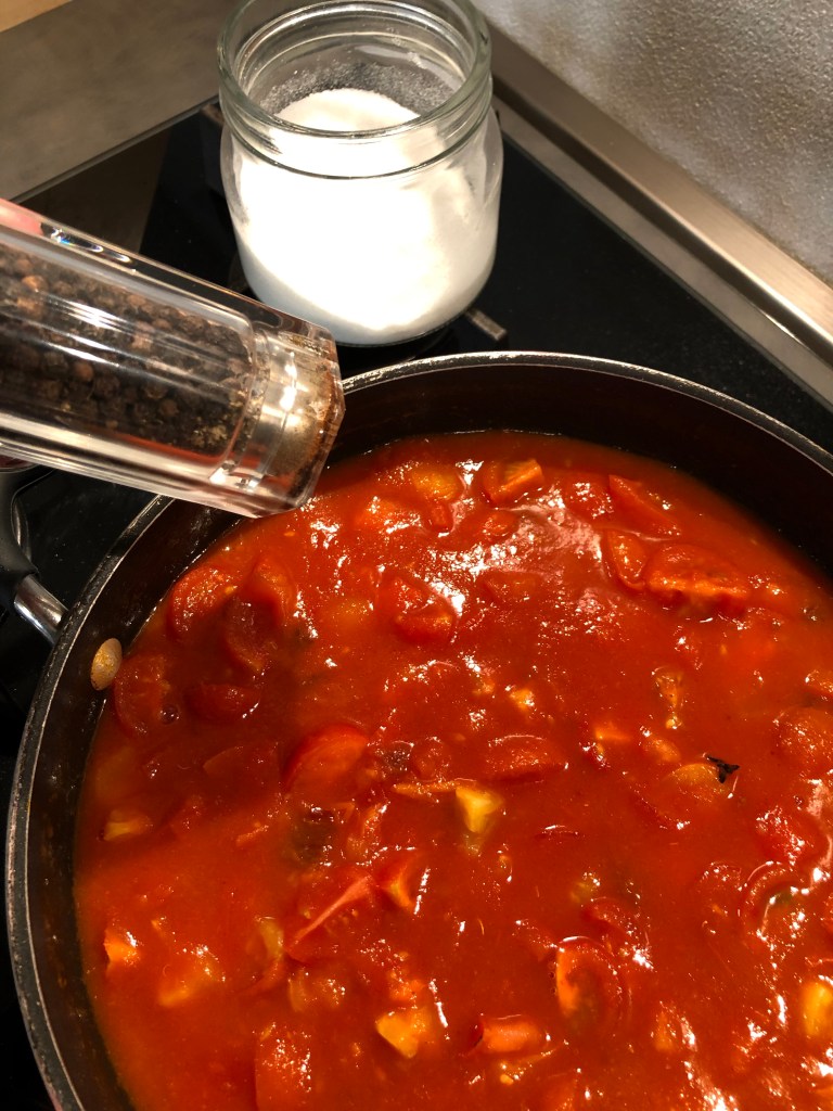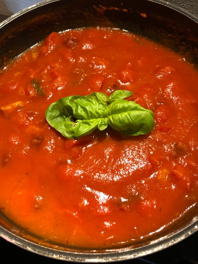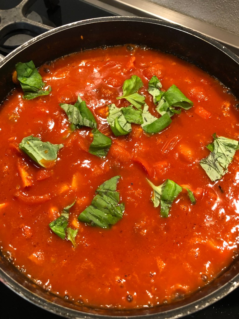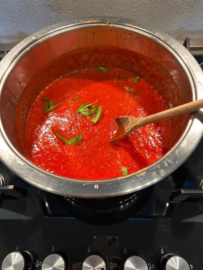Porto la salsa ottenuta sul fuoco, aggiungo del basilico fresco, assaggio e se serve aggiungo sale e pepe e porto a bollore, lascio una decina di minuti