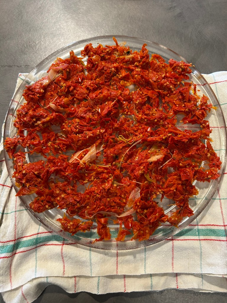 Li lascio raffreddare nell’acqua, poi li tolgo, e verifico che abbiano fatto il sottovuoto, il tappo deve fare il classico “clak” e deve essere piatto, metto le etichette e conservo in dispensa, gli scarti non li getto, li dispongo sul piatto del microonde e faccio essiccare girandoli spesso, pochi minuti per volta attenzione a non bruciarli, quando sono ben asciutti li lascio raffreddare e frullo finemente