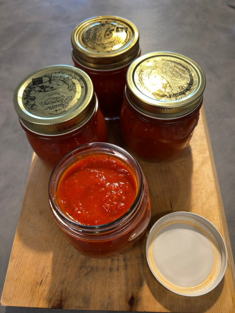 Riempio i vasetti con la salsa bollente e chiudo con i tappi