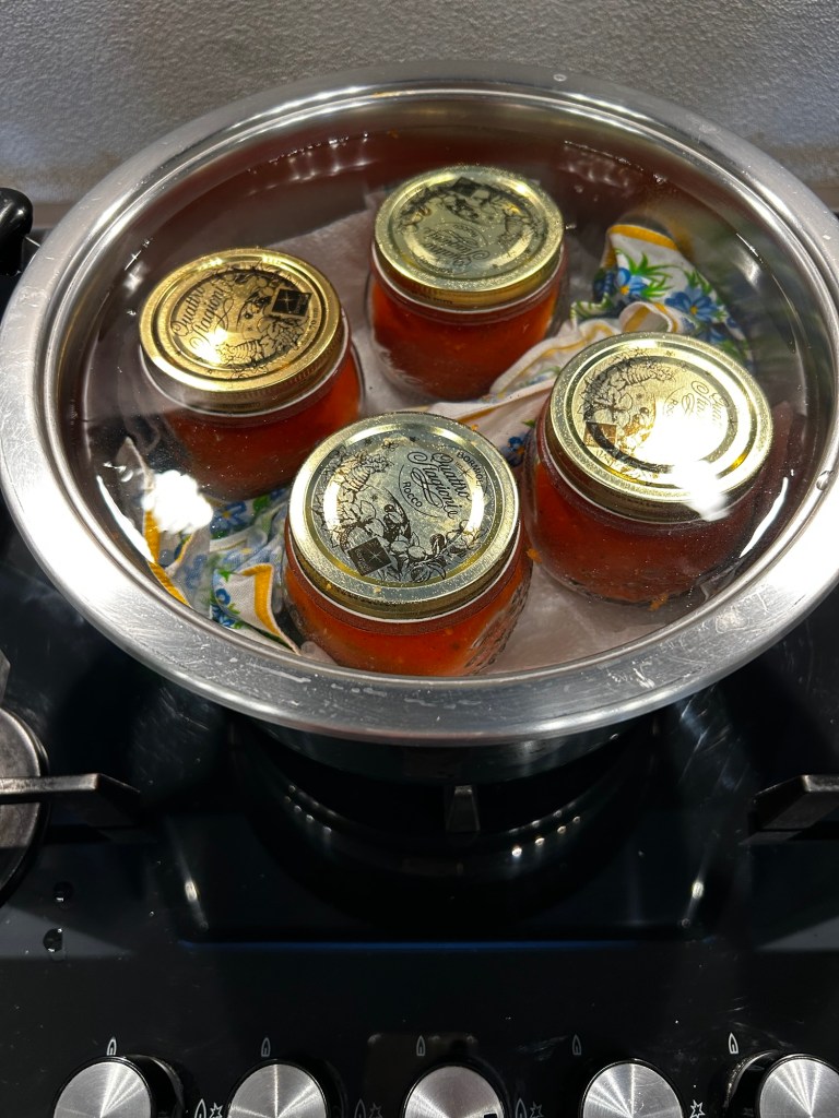 Inserisco i vasetti in una pentola, aggiungo acqua fino a ricoprire i tappi lascio sobbollire per 30 minuti, inserisco un canovaccio per non farli sbattere fra loro