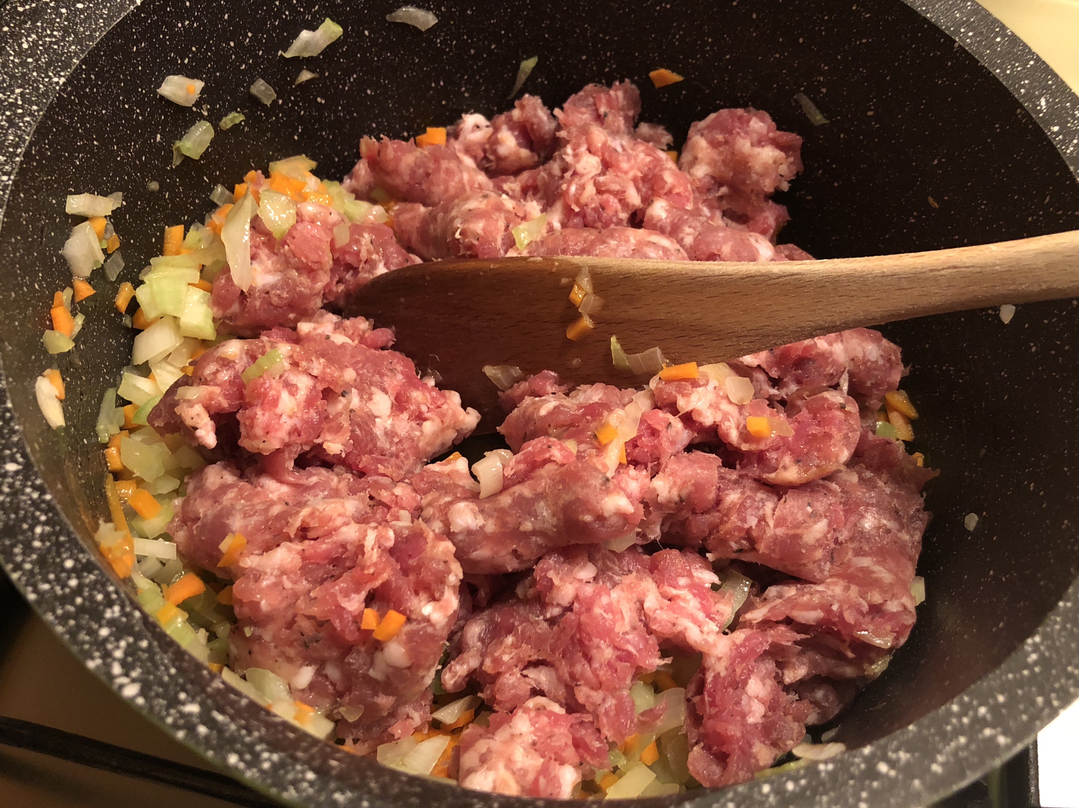Aggiungo la salsiccia sbriciolata dopo aver tolto il budello