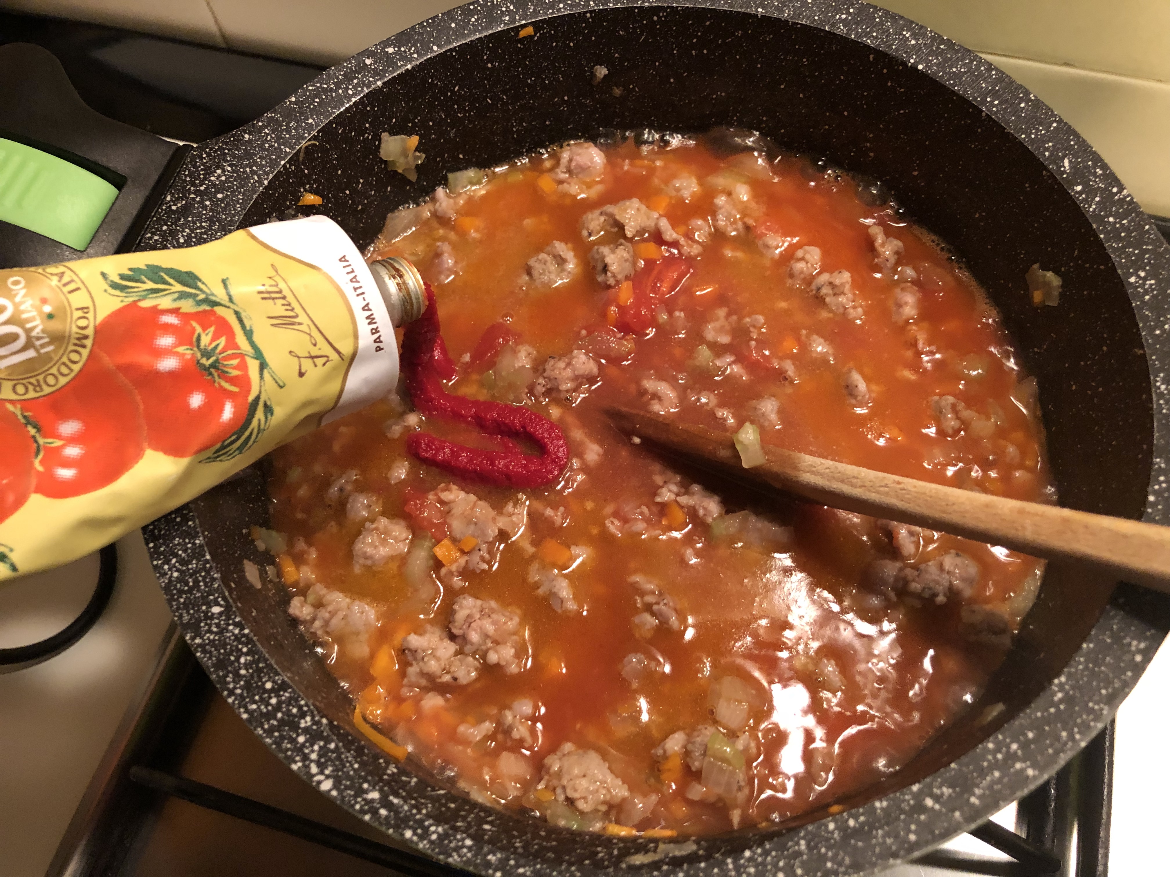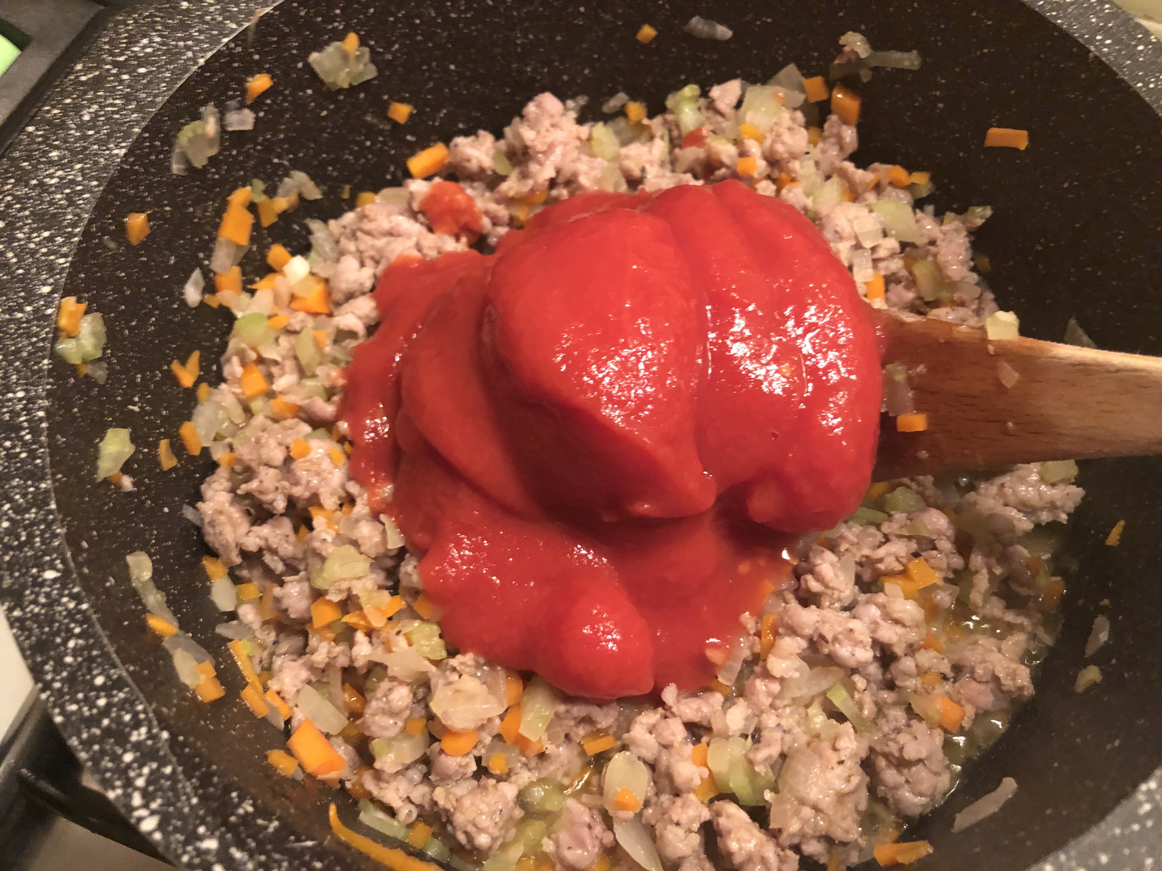 Lascio rosolare per bene poi aggiungo una scatola di pelati