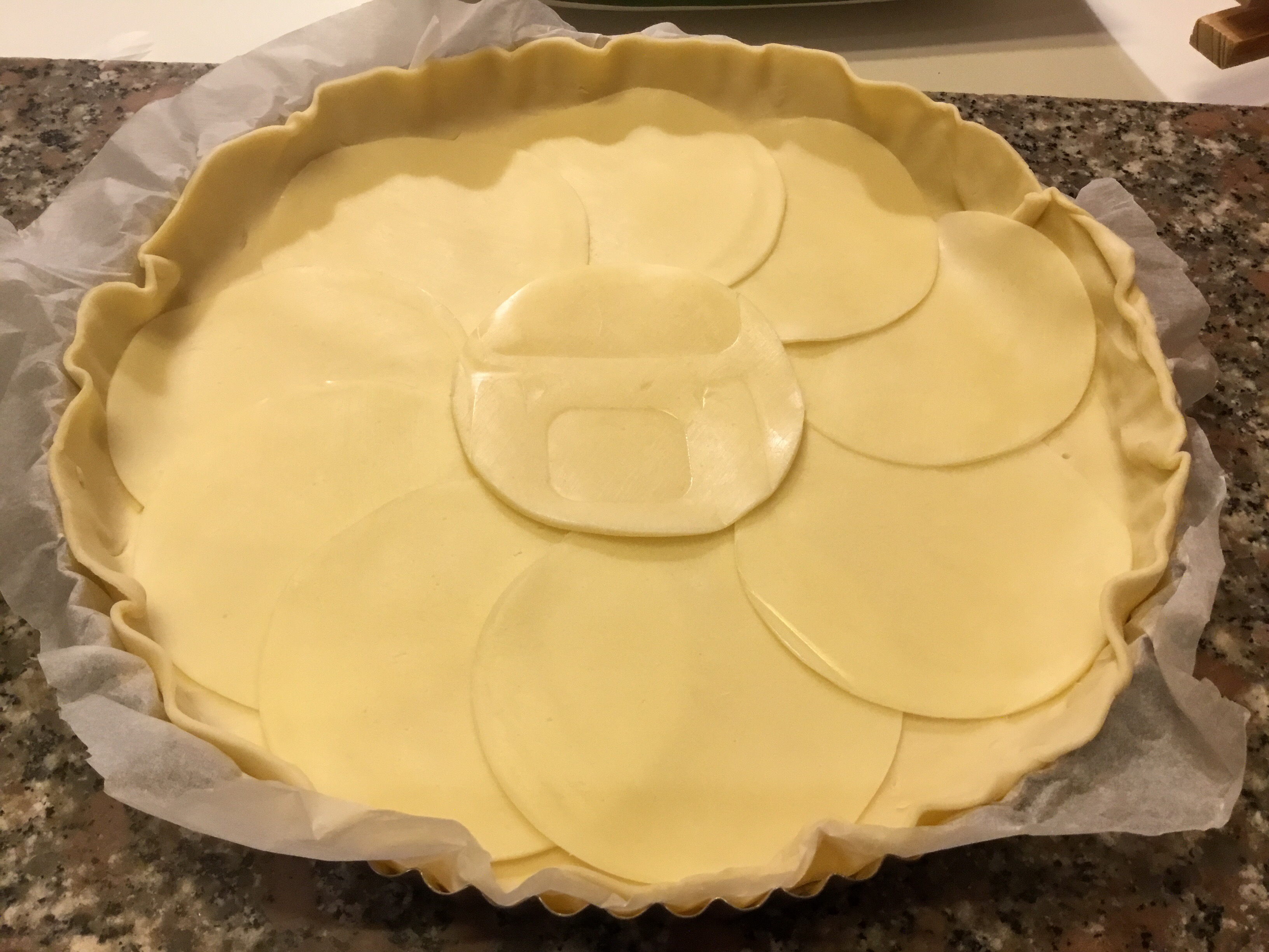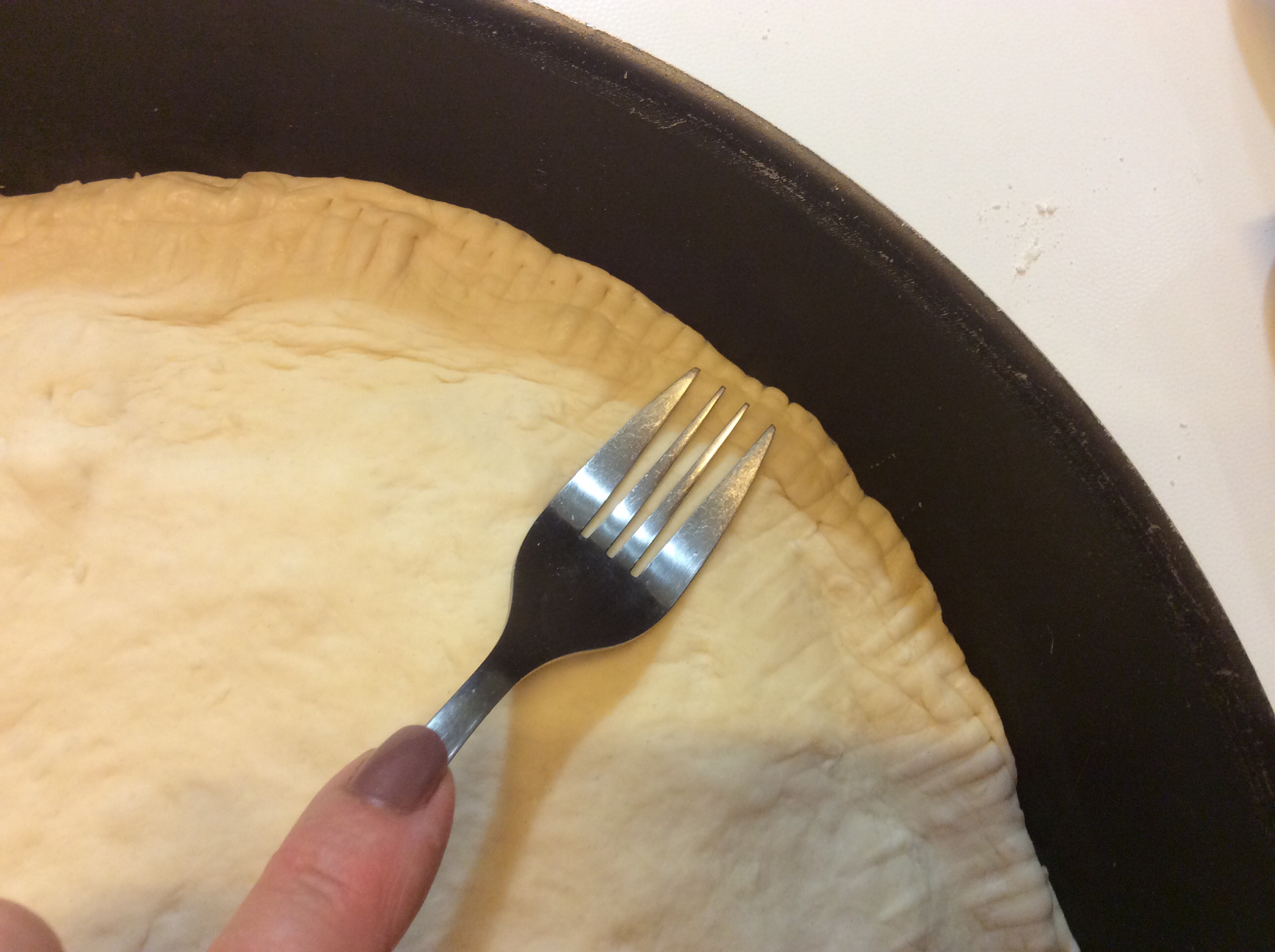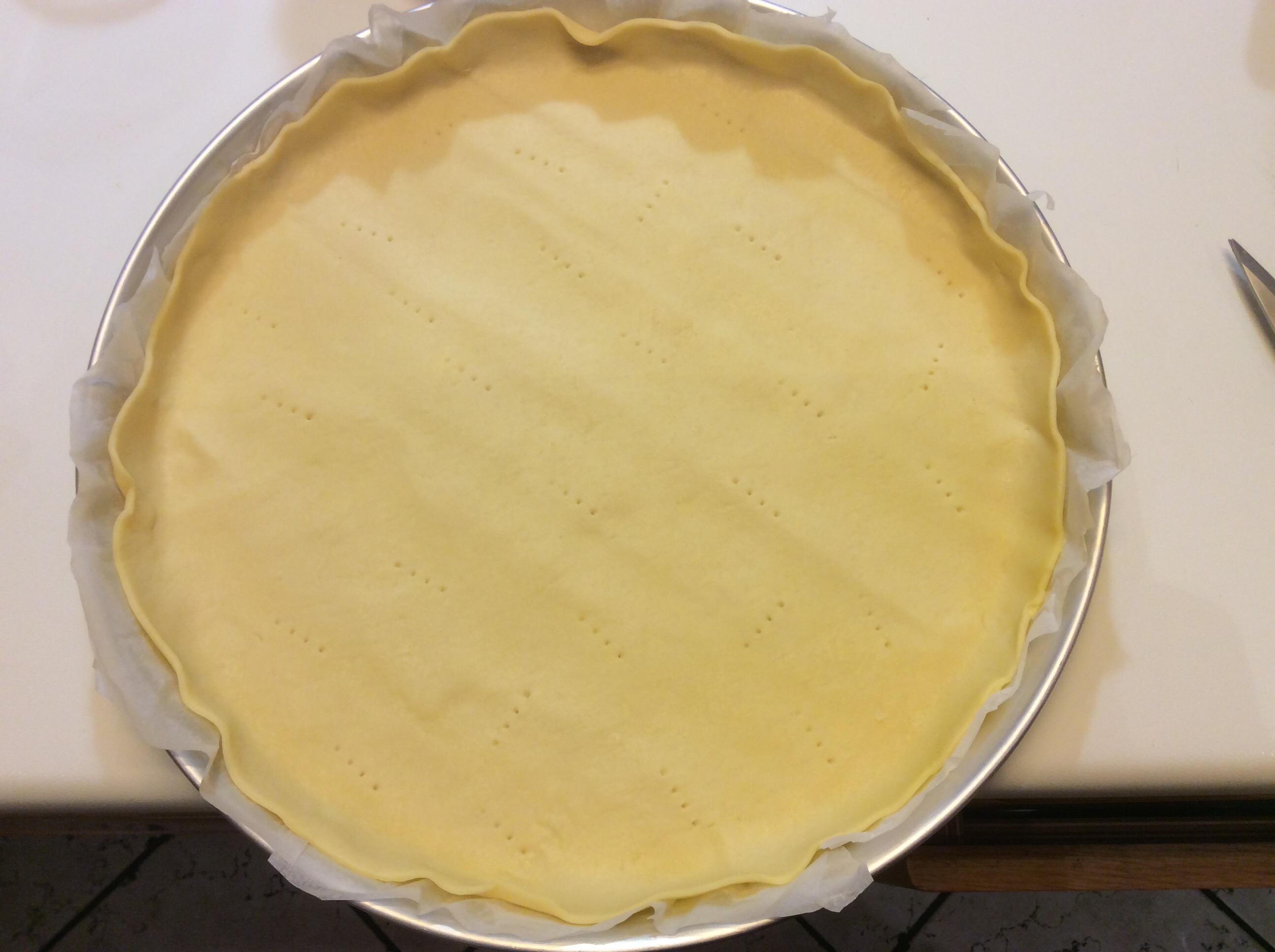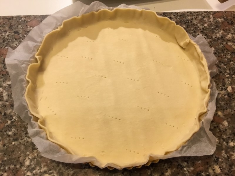 Srotolo la sfoglia e la dispongo nella tortiera con la sua carta forno, la buco bene con i rebbi di una forchetta su tutta la superficie