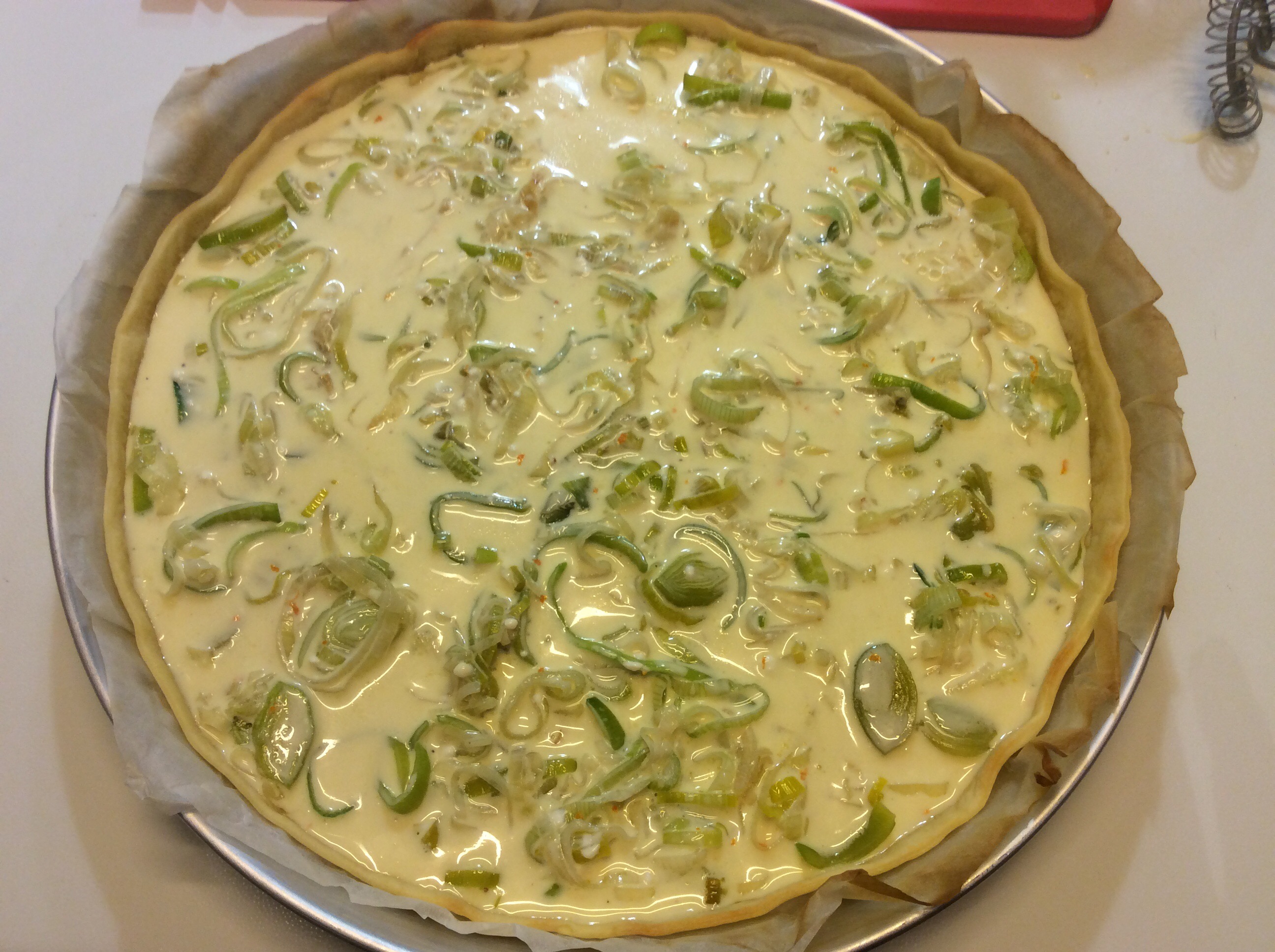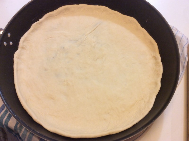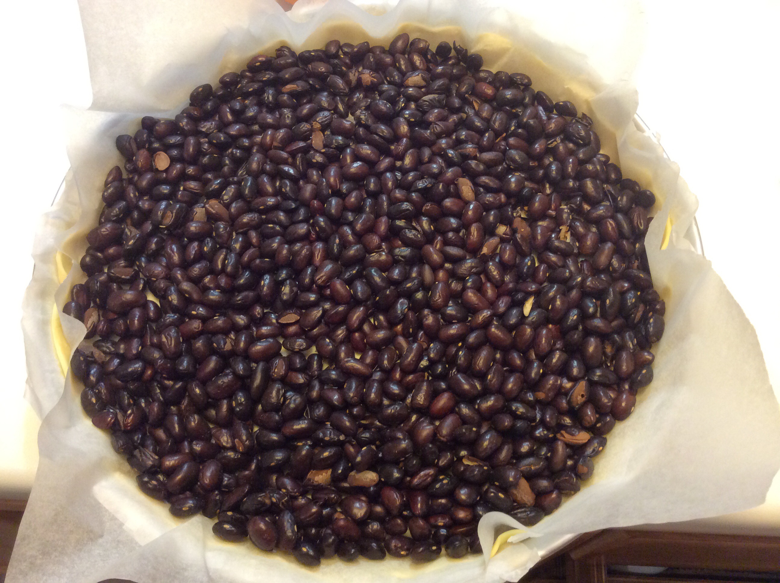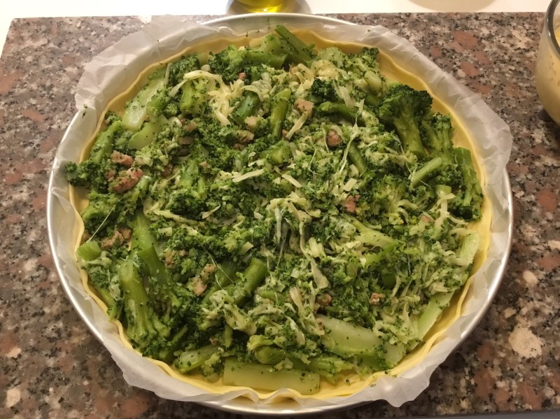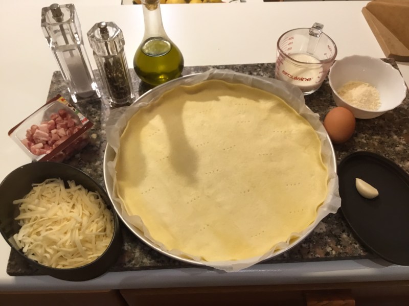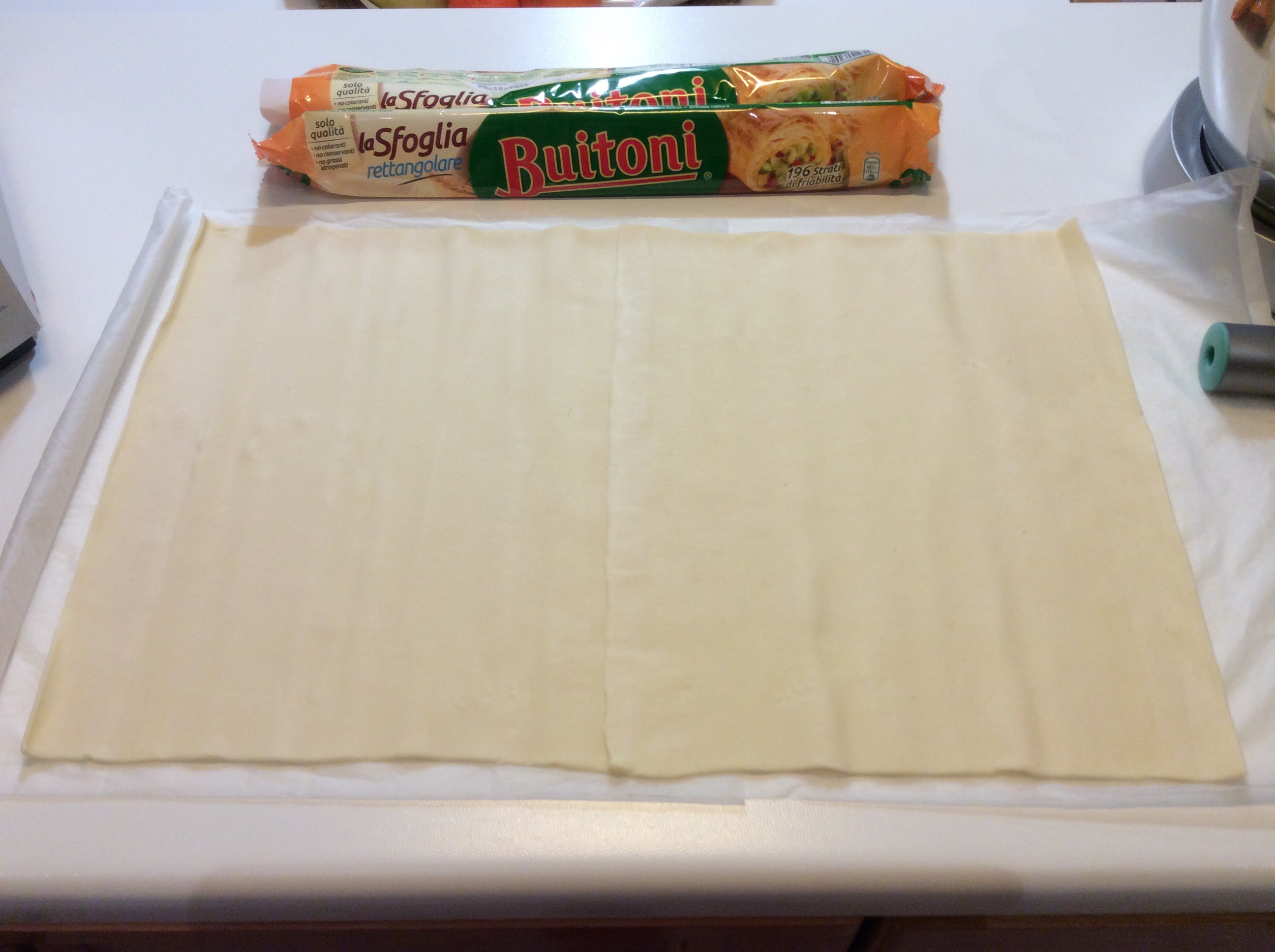 Srotolo la sfoglia e la dispongo nella tortiera con la sua carta forno, la buco bene con i rebbi di una forchetta su tutta la superficie