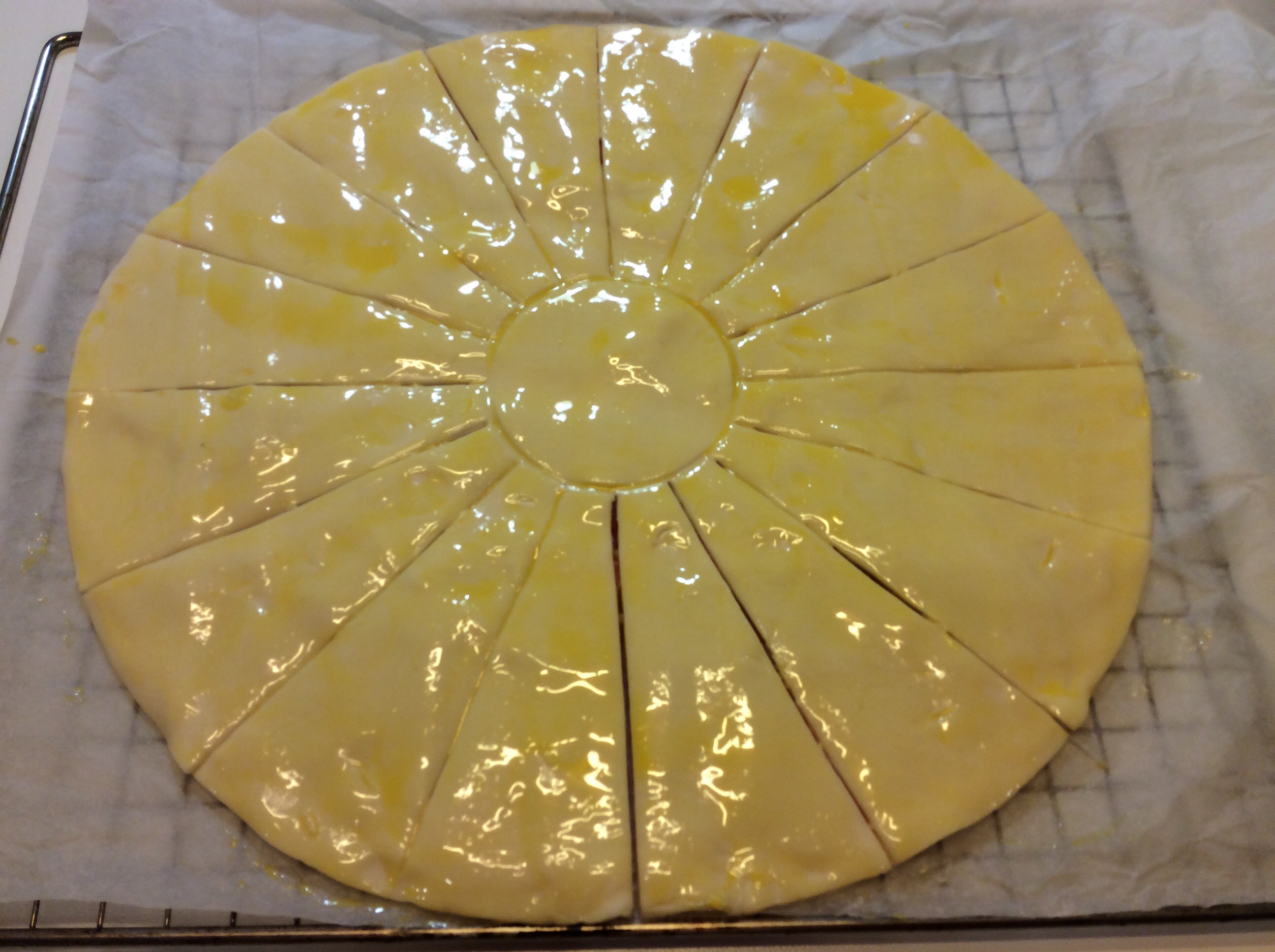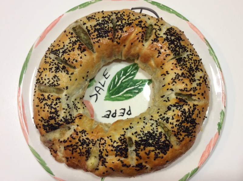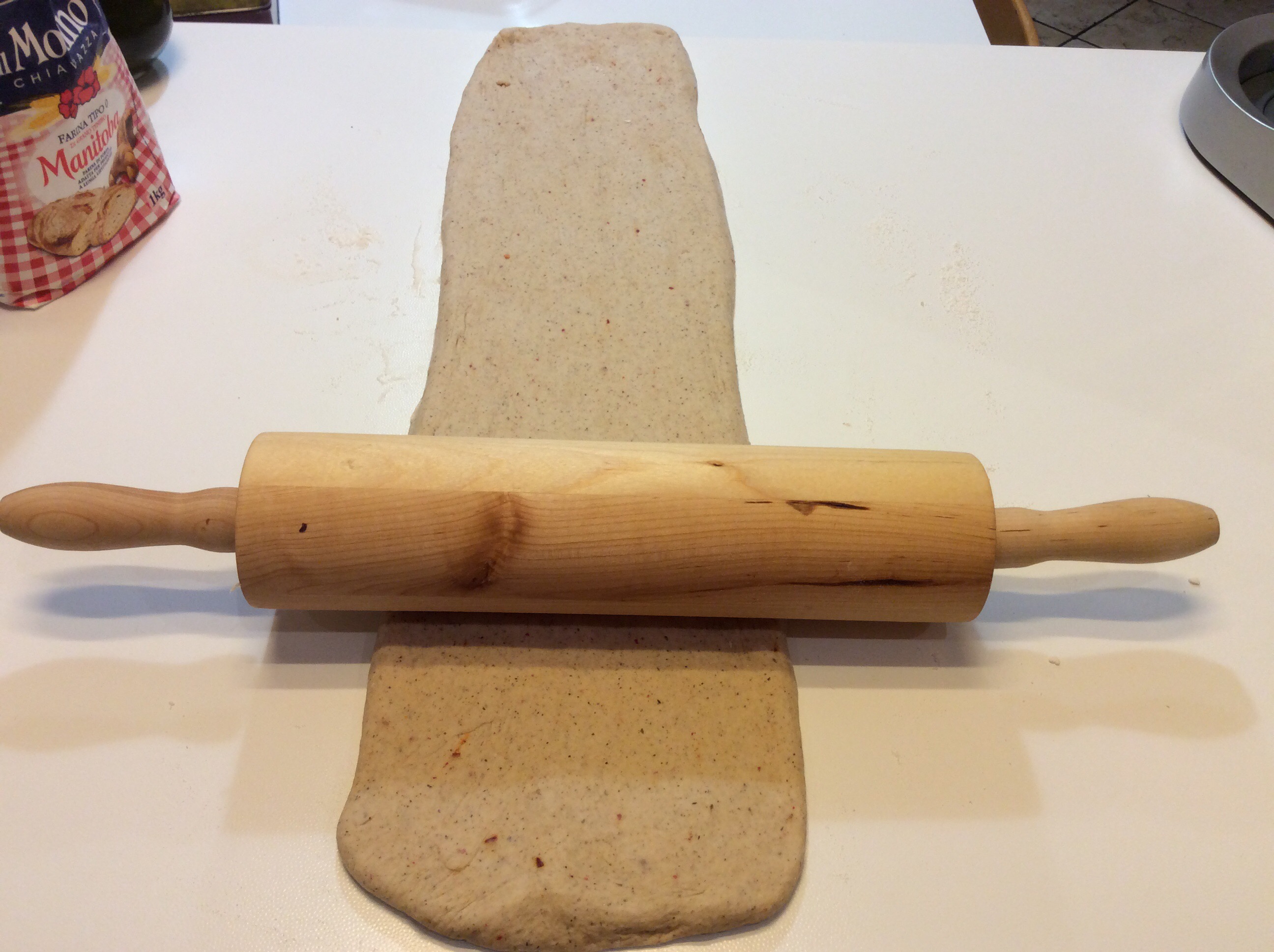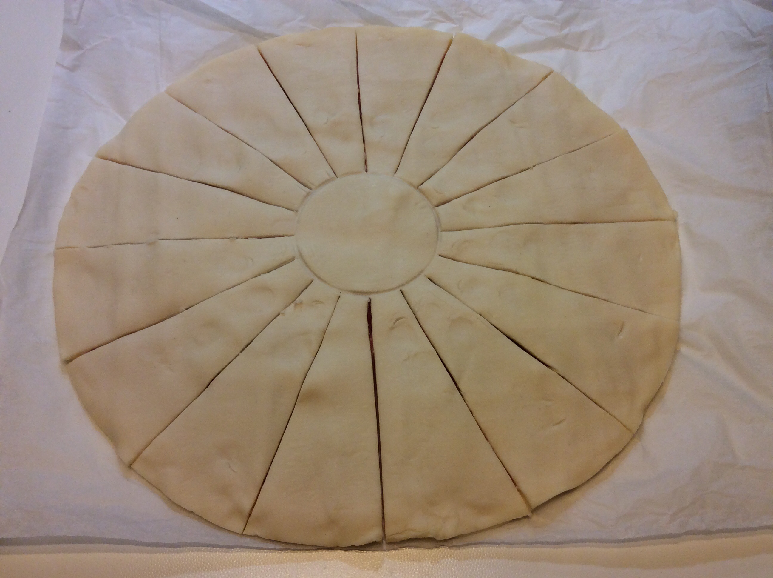 Srotolo la sfoglia e la dispongo nella tortiera con la sua carta forno, la buco bene con i rebbi di una forchetta su tutta la superficie