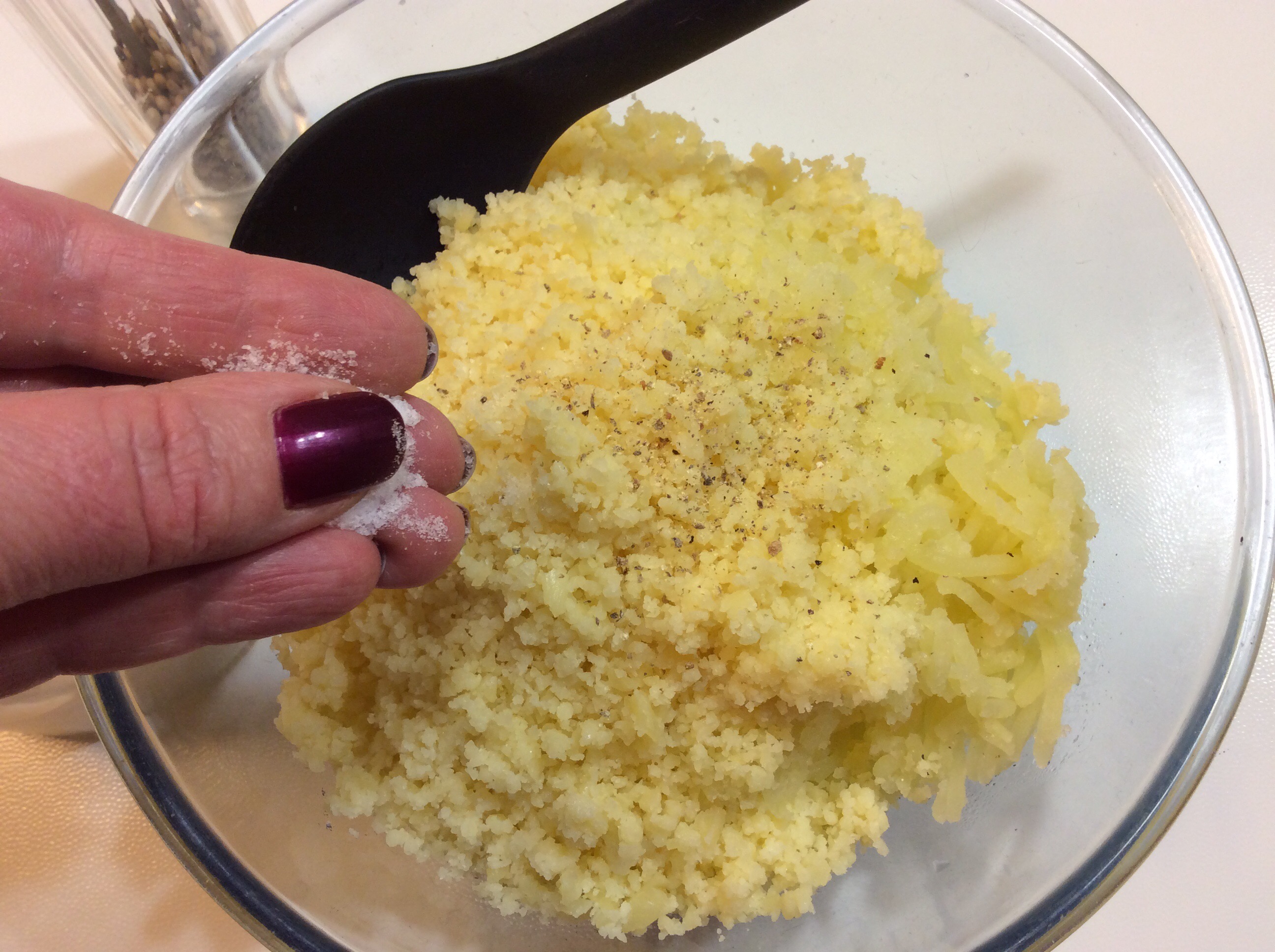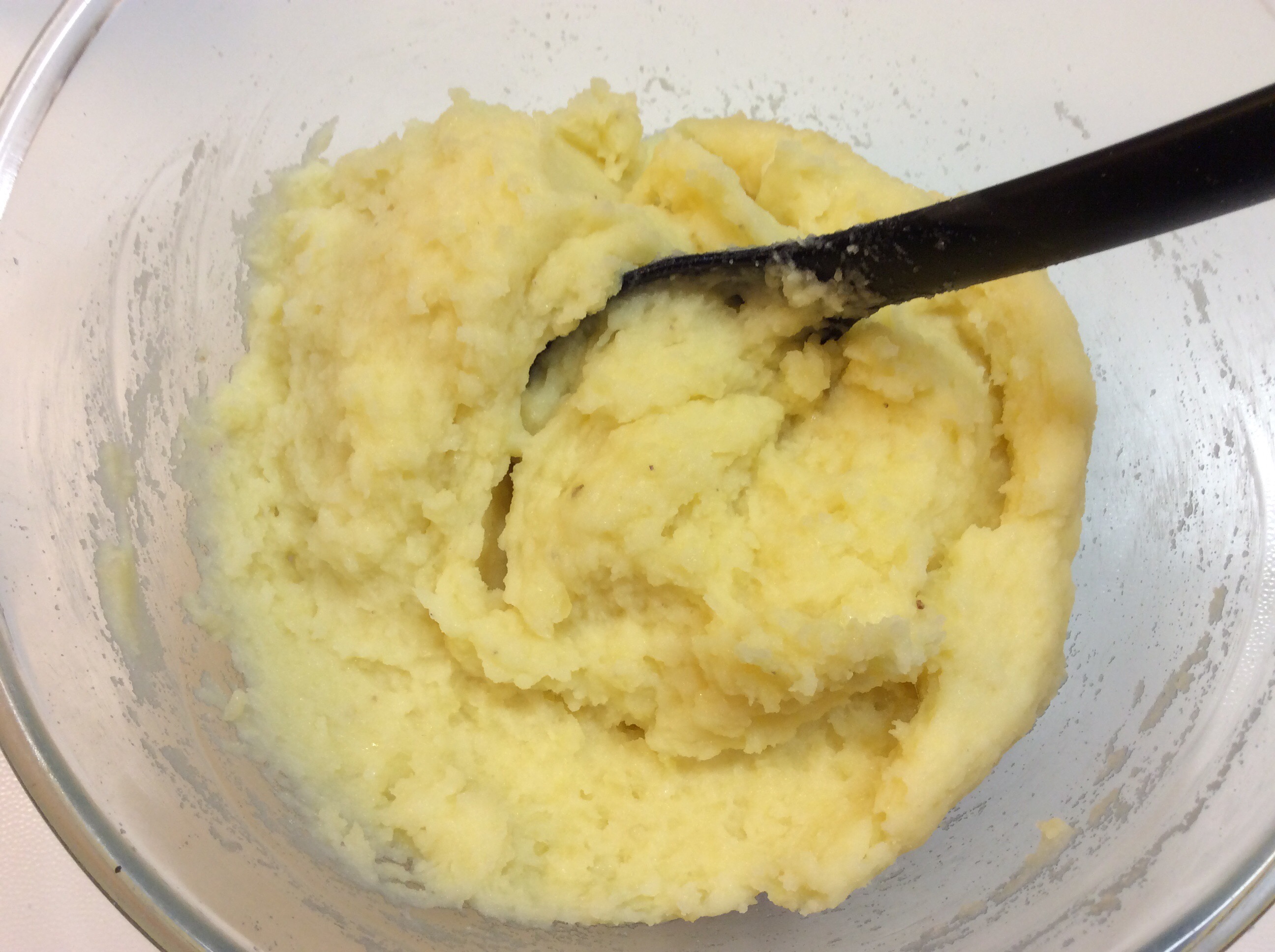 Lesso le patate, ne peso 600 gr poi le schiaccio con uno schiacciapatate ancora calde le metto in una ciotola con i formaggi tritati con un mixer