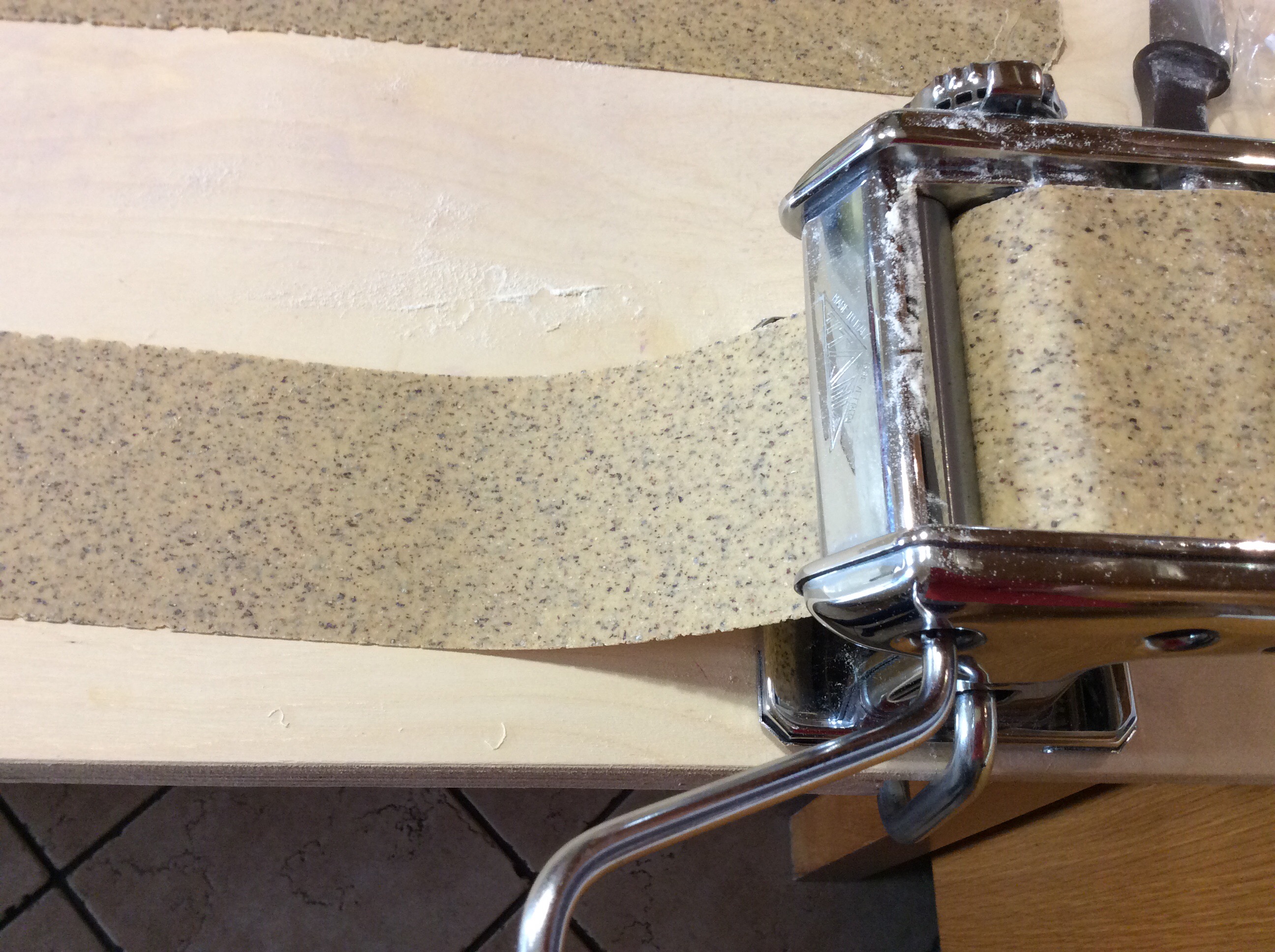 Passo nel rollo più largo della macchinetta, non spaventatevi perché nei primi passaggi si sbriciola, piegatela a metà e ripassatela più volte senza infarinarla perché fa più presa sui rulli