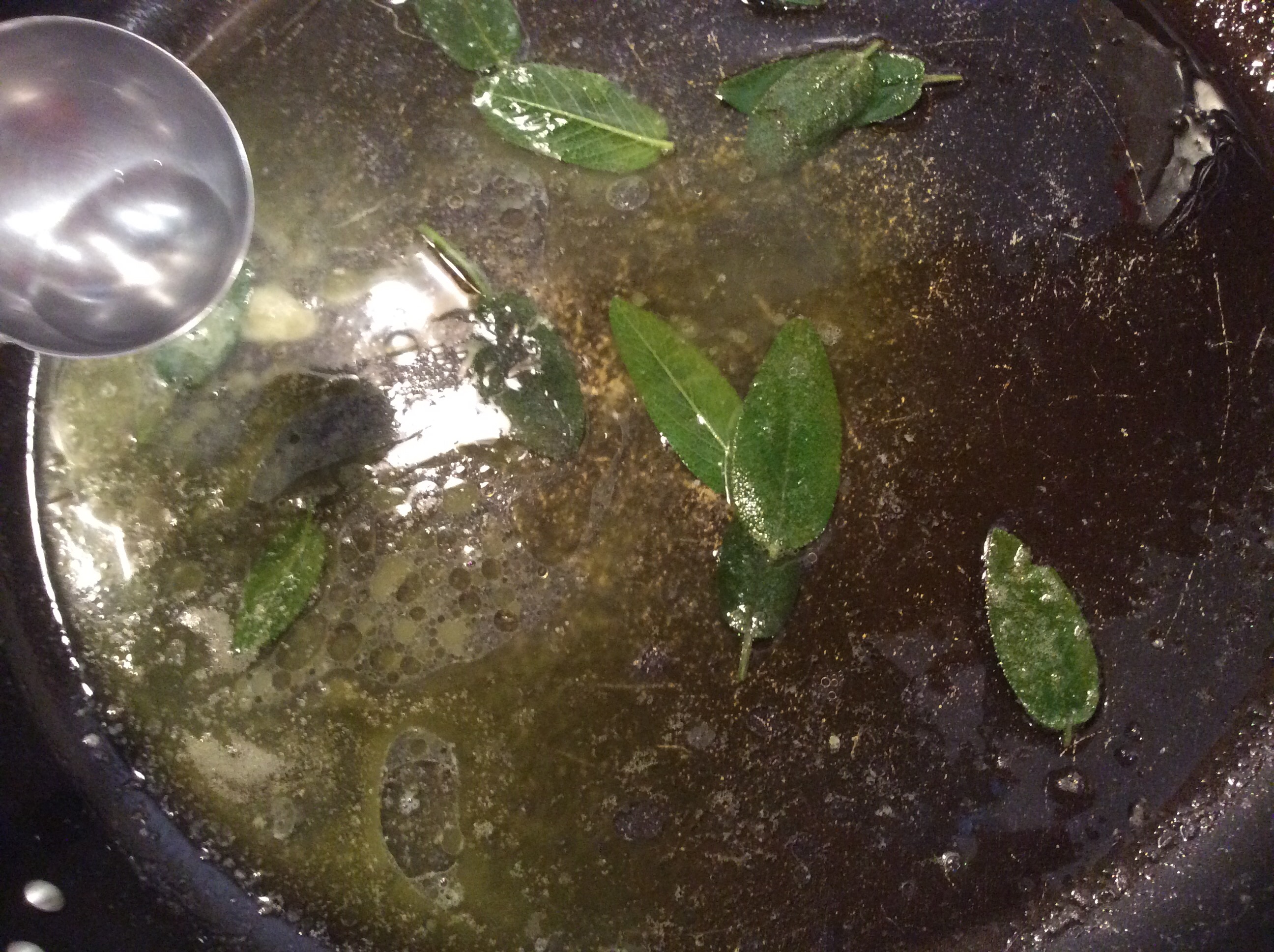 In una larga padella sciolgo il burro con un goccio di olio e la salvia, emulsiono muovendo la pentola avanti e indietro e aggiungo un mestolino di acqua di cottura dei ravioli