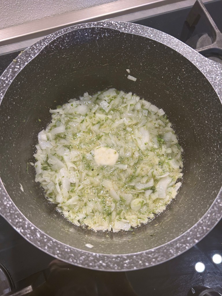 In una pentola metto dell”olio extravergine, il burro, il sedano e la cipolla e lascio soffriggere