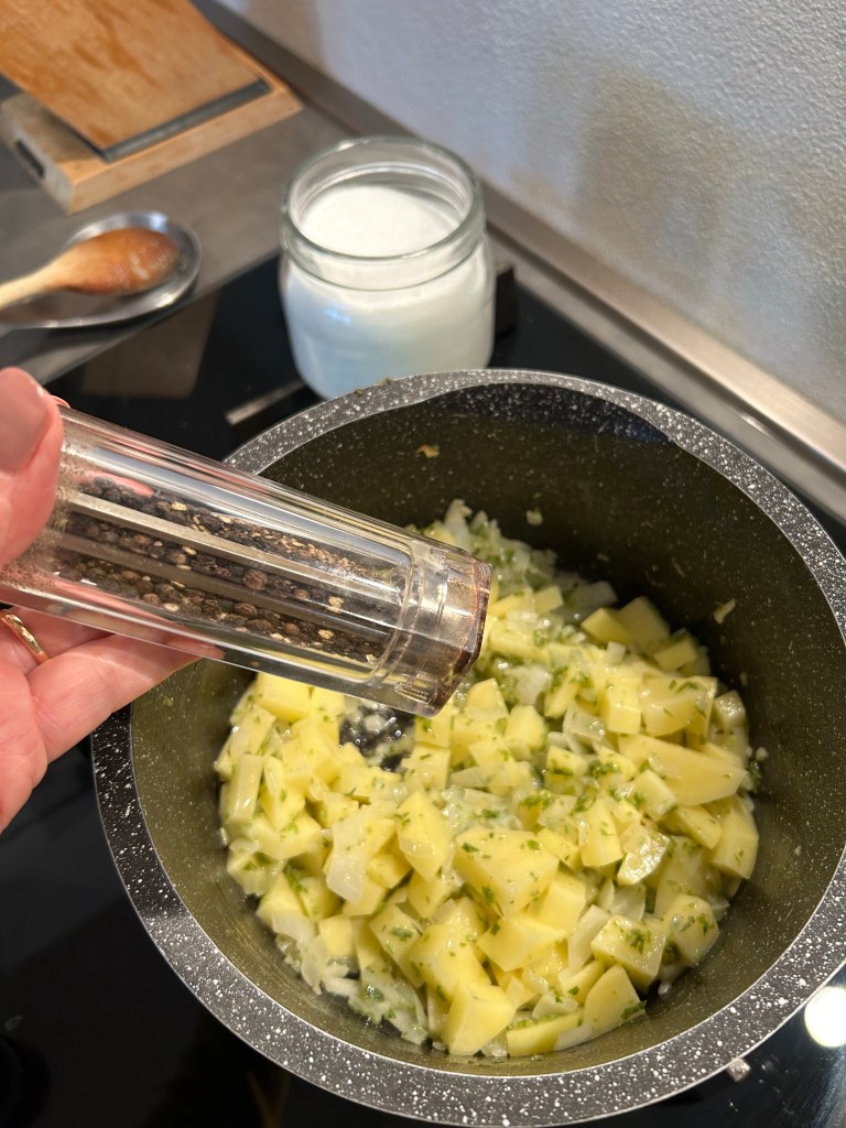 Aggiungo le patate e lascio rosolare per qualche minuto poi regolo di sale e pepe