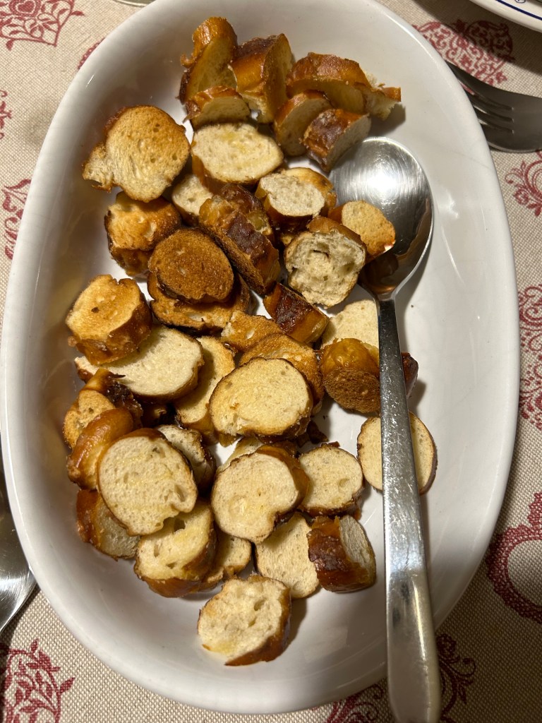 Io ho preparato con gli avanzi dei Brezel, un pane tipico tedesco dei crostini tostati in padella